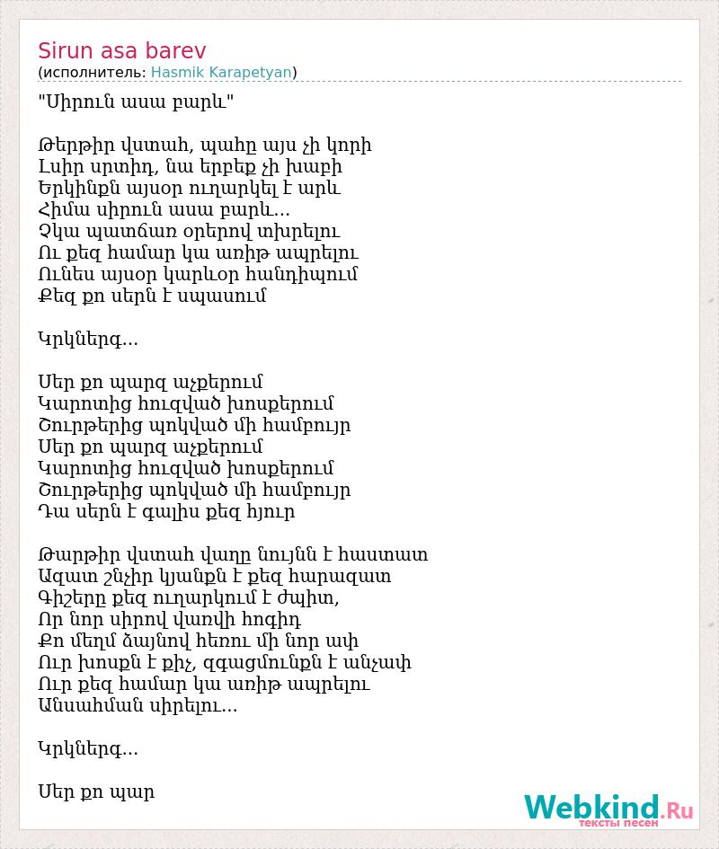 А как ты думаешь, о чем песня "Sirun asa barev" ?