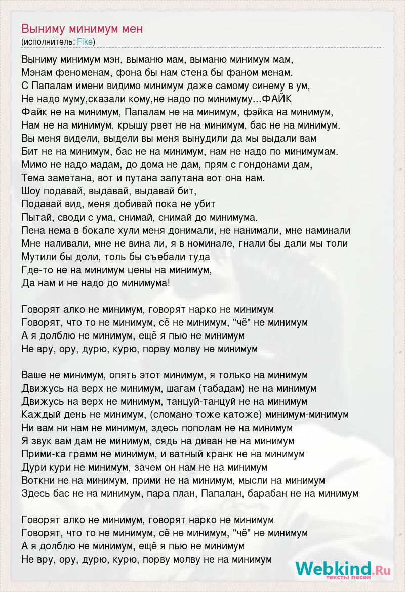 Выниму минимум мэн, выманю мам, выманю минимум мам, Мэнам феноменам, фона бы нам стена бы фаном менам. С Папалам имени видимо минимум даже самому синему в ум, Не надо муму,сказали кому,не надо по минимуму...ФАЙК Файк не на минимум, Папалам не на минимум, фэйка на минимум, Нам не на минимум, крышу рвет не на минимум, бас не на минимум. Вы меня видели, выдели вы меня вынудили да мы выдали вам Бит не на минимум, бас не на минимум, нам не надо по минимумам. Мимо не надо мадам, до дома не дам, прям с гондонами дам, Тема заметана, вот и путана запутана вот она нам. Шоу подавай, выдавай, выдавай бит, Подавай вид, меня добивай пока не убит Пытай, своди с ума, снимай, снимай до минимума. Пена нема в бокале хули меня донимали, не нанимали, мне наминали Мне наливали, мне не вина ли, я в номинале, гнали бы дали мы толи Мутили бы доли, толь бы съебали туда Где-то не на минимум цены на минимум, Да нам и не надо до минимума! Говорят алко не минимум, говорят нарко не минимум Говорят, что то не минимум, сё не минимум, "чё" не минимум А я долблю не минимум, ещё я пью не минимум Не вру, ору, дурю, курю, порву молву не минимум Ваше не минимум, опять этот минимум, я только на минимум Движусь на верх не минимум, шагам (табадам) не на минимум Движусь на верх не минимум, танцуй-танцуй не на минимум Каждый день не минимум, (сломано тоже катоже) минимум-минимум Ни вам ни нам не минимум, здесь пополам не на минимум Я звук вам дам не минимум, сядь на диван не на минимум Прими-ка грамм не минимум, и ватный кранк не на минимум Дури кури не минимум, зачем он нам не на минимум Воткни не на минимум, прими не на минимум, мысли на минимум Здесь бас не на минимум, пара план, Папалан, барабан не на минимум Говорят алко не минимум, говорят нарко не минимум Говорят, что то не минимум, сё не минимум, "чё" не минимум А я долблю не минимум, ещё я пью не минимум Не вру, ору, дурю, курю, порву молву не на минимум