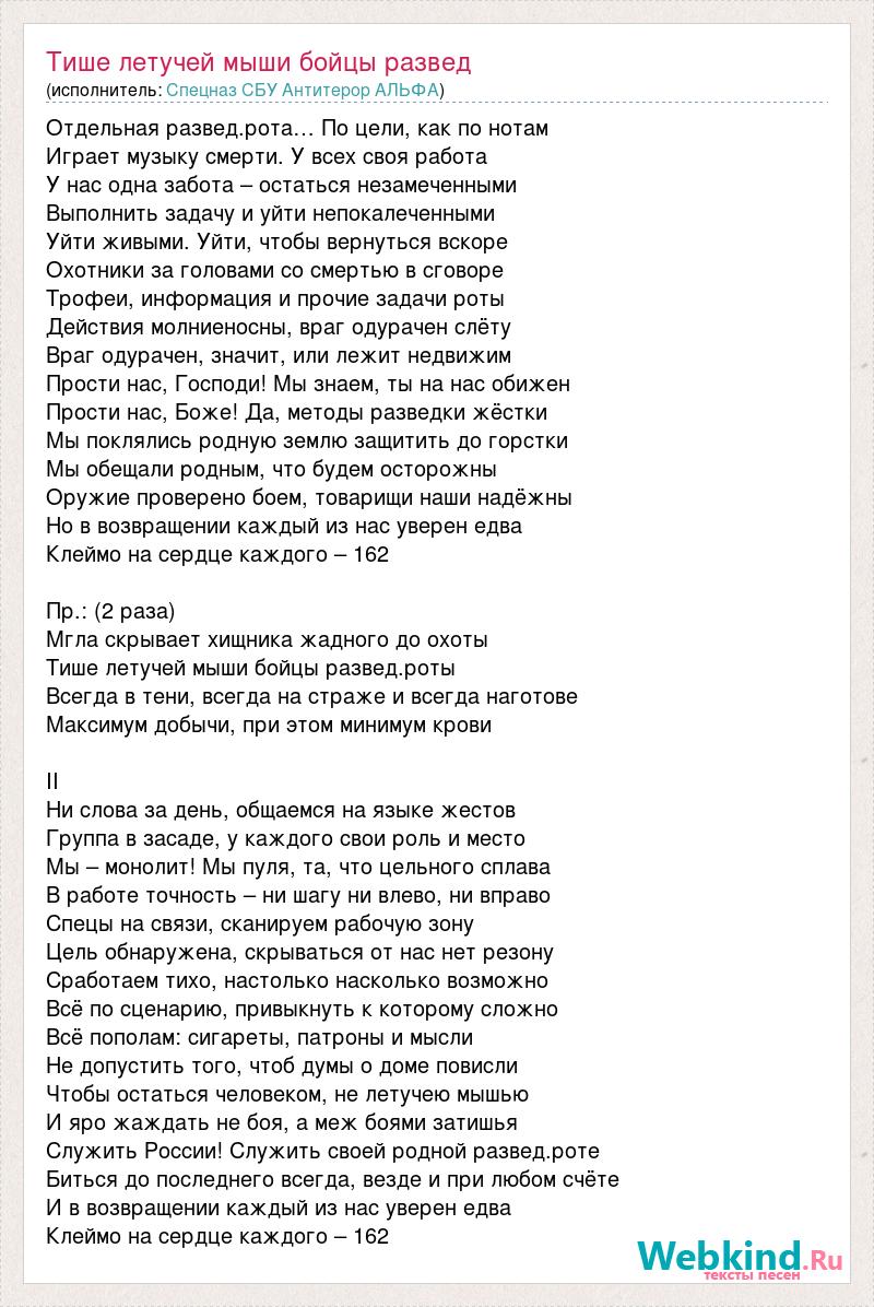 Отдельная развед.рота… По цели, как по нотам Играет музыку смерти. У всех своя работа У нас одна забота – остаться незамеченными Выполнить задачу и уйти непокалеченными Уйти живыми. Уйти, чтобы вернуться вскоре Охотники за головами со смертью в сговоре Трофеи, информация и прочие задачи роты Действия молниеносны, враг одурачен слёту Враг одурачен, значит, или лежит недвижим Прости нас, Господи! Мы знаем, ты на нас обижен Прости нас, Боже! Да, методы разведки жёстки Мы поклялись родную землю защитить до горстки Мы обещали родным, что будем осторожны Оружие проверено боем, товарищи наши надёжны Но в возвращении каждый из нас уверен едва Клеймо на сердце каждого – 162 Пр.: (2 раза) Мгла скрывает хищника жадного до охоты Тише летучей мыши бойцы развед.роты Всегда в тени, всегда на страже и всегда наготове Максимум добычи, при этом минимум крови II Ни слова за день, общаемся на языке жестов Группа в засаде, у каждого свои роль и место Мы – монолит! Мы пуля, та, что цельного сплава В работе точность – ни шагу ни влево, ни вправо Спецы на связи, сканируем рабочую зону Цель обнаружена, скрываться от нас нет резону Сработаем тихо, настолько насколько возможно Всё по сценарию, привыкнуть к которому сложно Всё пополам: сигареты, патроны и мысли Не допустить того, чтоб думы о доме повисли Чтобы остаться человеком, не летучею мышью И яро жаждать не боя, а меж боями затишья Служить России! Служить своей родной развед.роте Биться до последнего всегда, везде и при любом счёте И в возвращении каждый из нас уверен едва Клеймо на сердце каждого – 162