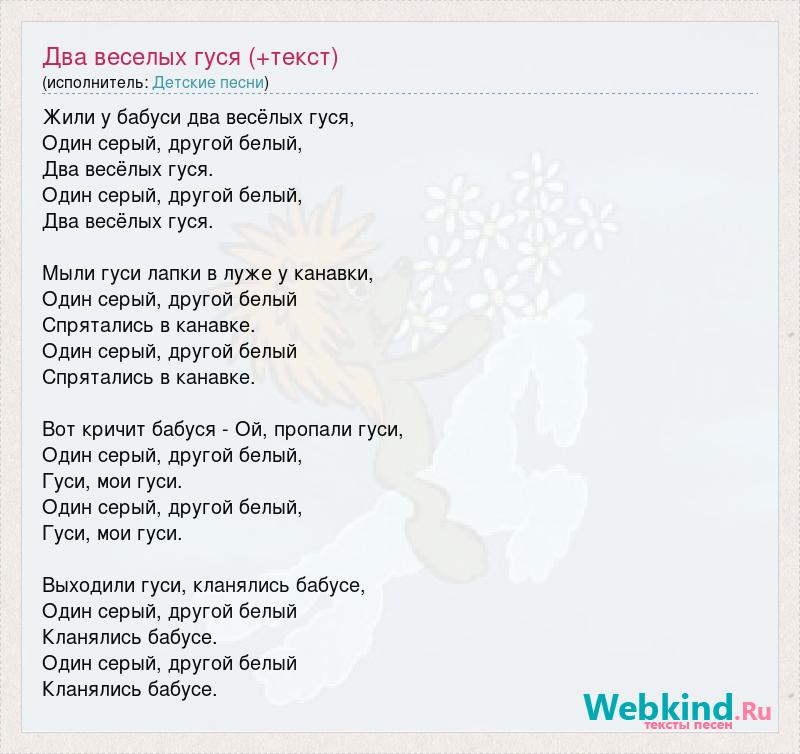Жили у бабуси два весёлых гуся, Один серый, другой белый, Два весёлых гуся. Один серый, другой белый, Два весёлых гуся. Мыли гуси лапки в луже у канавки, Один серый, другой белый Спрятались в канавке. Один серый, другой белый Спрятались в канавке. Вот кричит бабуся - Ой, пропали гуси, Один серый, другой белый, Гуси, мои гуси. Один серый, другой белый, Гуси, мои гуси. Выходили гуси, кланялись бабусе, Один серый, другой белый Кланялись бабусе. Один серый, другой белый Кланялись бабусе.