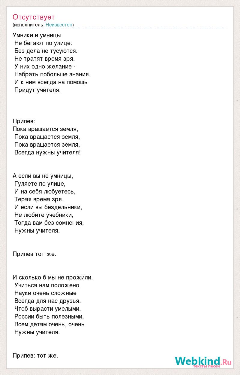 Умники и умницы Не бегают по улице. Без дела не тусуются. Не тратят время зря. У них одно желание - Набрать побольше знания. И к ним всегда на помощь Придут учителя. Припев: Пока вращается земля, Пока вращается земля, Пока вращается земля, Всегда нужны учителя! А если вы не умницы, Гуляете по улице, И на себя любуетесь, Теряя время зря. И если вы бездельники, Не любите учебники, Тогда вам без сомнения, Нужны учителя. Припев тот же. И сколько б мы не прожили. Учиться нам положено. Науки очень сложные Всегда для нас друзья. Чтоб вырасти умелыми. России быть полезными, Всем детям очень, очень Нужны учителя. Припев: тот же.