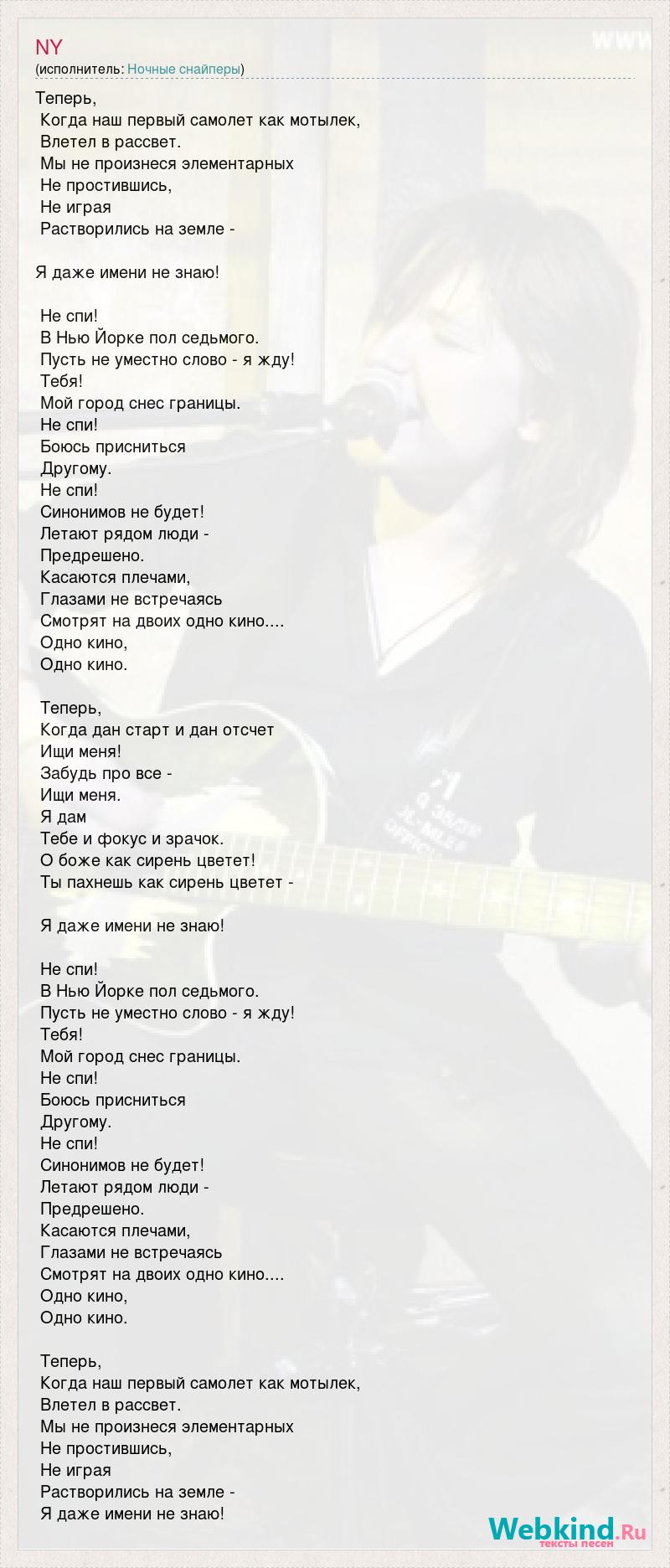Теперь, Когда наш первый самолет как мотылек, Влетел в рассвет. Мы не произнеся элементарных Не простившись, Не играя Растворились на земле - Я даже имени не знаю! Не спи! В Нью Йорке пол седьмого. Пусть не уместно слово - я жду! Тебя! Мой город снес границы. Не спи! Боюсь присниться Другому. Не спи! Синонимов не будет! Летают рядом люди - Предрешено. Касаются плечами, Глазами не встречаясь Смотрят на двоих одно кино.... Одно кино, Одно кино. Теперь, Когда дан старт и дан отсчет Ищи меня! Забудь про все - Ищи меня. Я дам Тебе и фокус и зрачок. О боже как сирень цветет! Ты пахнешь как сирень цветет - Я даже имени не знаю! Не спи! В Нью Йорке пол седьмого. Пусть не уместно слово - я жду! Тебя! Мой город снес границы. Не спи! Боюсь присниться Другому. Не спи! Синонимов не будет! Летают рядом люди - Предрешено. Касаются плечами, Глазами не встречаясь Смотрят на двоих одно кино.... Одно кино, Одно кино. Теперь, Когда наш первый самолет как мотылек, Влетел в рассвет. Мы не произнеся элементарных Не простившись, Не играя Растворились на земле - Я даже имени не знаю!