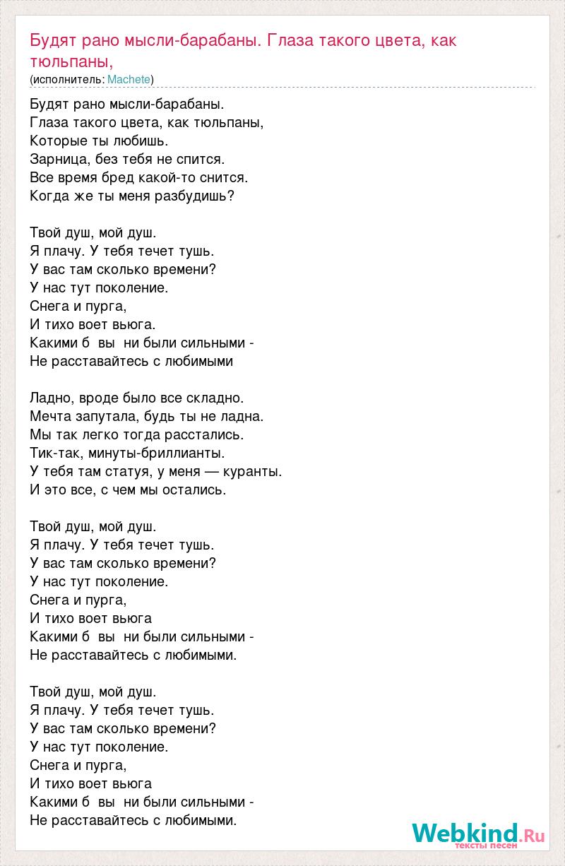 Будят рано мысли-барабаны. Глаза такого цвета, как тюльпаны, Которые ты любишь. Зарница, без тебя не спится. Все время бред какой-то снится. Когда же ты меня разбудишь? Твой душ, мой душ. Я плачу. У тебя течет тушь. У вас там сколько времени? У нас тут поколение. Снега и пурга, И тихо воет вьюга. Какими б вы ни были сильными - Не расставайтесь с любимыми Ладно, вроде было все складно. Мечта запутала, будь ты не ладна. Мы так легко тогда расстались. Тик-так, минуты-бриллианты. У тебя там статуя, у меня — куранты. И это все, с чем мы остались. Твой душ, мой душ. Я плачу. У тебя течет тушь. У вас там сколько времени? У нас тут поколение. Снега и пурга, И тихо воет вьюга Какими б вы ни были сильными - Не расставайтесь с любимыми. Твой душ, мой душ. Я плачу. У тебя течет тушь. У вас там сколько времени? У нас тут поколение. Снега и пурга, И тихо воет вьюга Какими б вы ни были сильными - Не расставайтесь с любимыми.