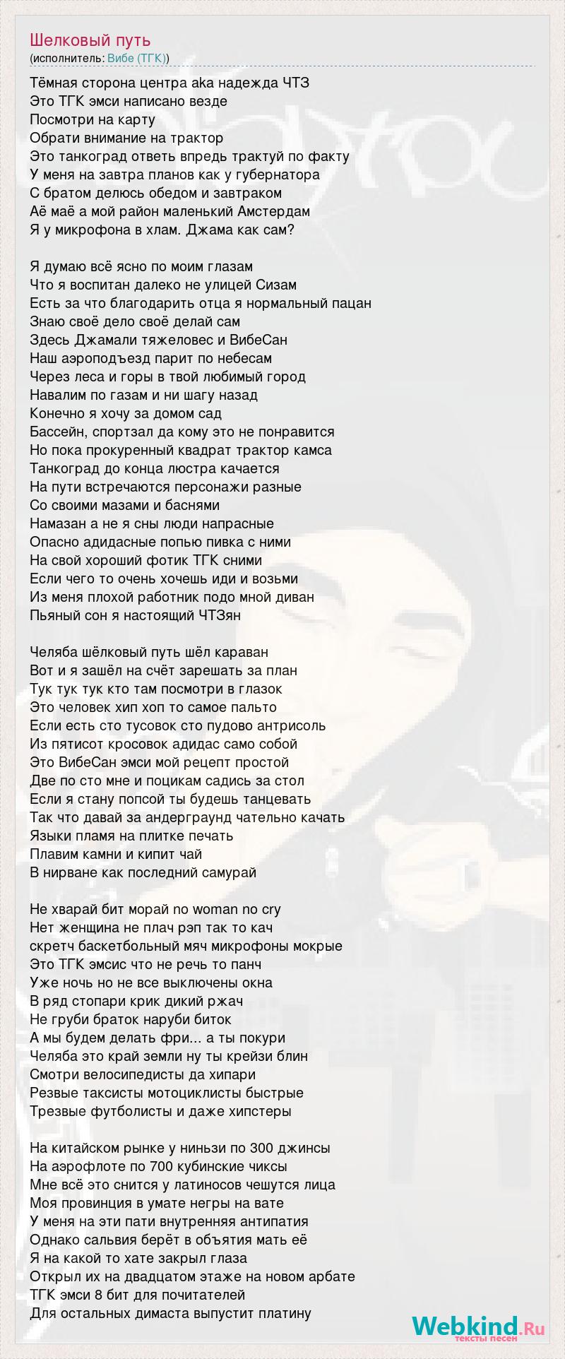 Тёмная сторона центра aka надежда ЧТЗ Это ТГК эмси написано везде Посмотри на карту Обрати внимание на трактор Это танкоград ответь впредь трактуй по факту У меня на завтра планов как у губернатора С братом делюсь обедом и завтраком Аё маё а мой район маленький Амстердам Я у микрофона в хлам. Джама как сам? Я думаю всё ясно по моим глазам Что я воспитан далеко не улицей Сизам Есть за что благодарить отца я нормальный пацан Знаю своё дело своё делай сам Здесь Джамали тяжеловес и ВибеСан Наш аэроподъезд парит по небесам Через леса и горы в твой любимый город Навалим по газам и ни шагу назад Конечно я хочу за домом сад Бассейн, спортзал да кому это не понравится Но пока прокуренный квадрат трактор камса Танкоград до конца люстра качается На пути встречаются персонажи разные Со своими мазами и баснями Намазан а не я сны люди напрасные Опасно адидасные попью пивка с ними На свой хороший фотик ТГК сними Если чего то очень хочешь иди и возьми Из меня плохой работник подо мной диван Пьяный сон я настоящий ЧТЗян Челяба шёлковый путь шёл караван Вот и я зашёл на счёт зарешать за план Тук тук тук кто там посмотри в глазок Это человек хип хоп то самое пальто Если есть сто тусовок сто пудово антрисоль Из пятисот кросовок адидас само собой Это ВибеСан эмси мой рецепт простой Две по сто мне и поцикам садись за стол Если я стану попсой ты будешь танцевать Так что давай за андерграунд чательно качать Языки пламя на плитке печать Плавим камни и кипит чай В нирване как последний самурай Не хварай бит морай no woman no cry Нет женщина не плач рэп так то кач скретч баскетбольный мяч микрофоны мокрые Это ТГК эмсис что не речь то панч Уже ночь но не все выключены окна В ряд стопари крик дикий ржач Не груби браток наруби биток А мы будем делать фри... а ты покури Челяба это край земли ну ты крейзи блин Смотри велосипедисты да хипари Резвые таксисты мотоциклисты быстрые Трезвые футболисты и даже хипстеры На китайском рынке у ниньзи по 300 джинсы На аэрофлоте по 700 кубинские чиксы Мне всё это снится у латиносов чешутся лица Моя провинция в умате негры на вате У меня на эти пати внутренняя антипатия Однако сальвия берёт в объятия мать её Я на какой то хате закрыл глаза Открыл их на двадцатом этаже на новом арбате ТГК эмси 8 бит для почитателей Для остальных димаста выпустит платину