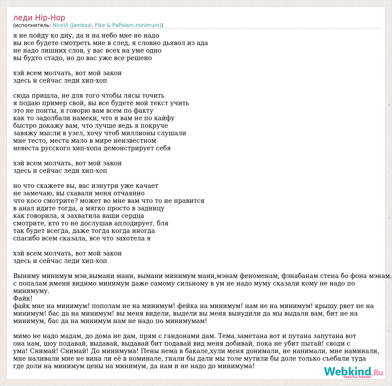 я не пойду ко дну, да и на небо мне не надо вы все будете смотреть мне в след, я словно дьявол из ада не надо лишних слов, у вас всех на уме одно вы будто стадо, но до вас уже все решено хэй всем молчать, вот мой закон здесь и сейчас леди хип-хоп сюда пришла, не для того чтобы лясы точить я подаю пример свой, вы все будете мой текст учить это не понты, я говорю вам всем по факту как то задолбали намеки, что я вам не по кайфу быстро докажу вам, что лучше ведь я покруче завяжу мысли в узел, хочу чтоб миллионы слушали мне тесто, места мало в мире неизвестном невеста русского хип-хопа демонстрирует себя хэй всем молчать, вот мой закон здесь и сейчас леди хип-хоп но что скажете вы, вас изнутри уже качает не замечаю, вы схавали меня отчаянно что косо смотрите? может во мне вам что то не нравится в анал идите тогда, а мягко просто в задницу как говорила, я захватила ваши сердца смотрите, кто то не дослушав аплодирует, бля так будет всегда, даже тогда когда иногда спасибо всем сказала, все что захотела я хэй всем молчать, вот мой закон здесь и сейчас леди хип-хоп Выниму минимум мэн,вымани манн, вымани минимум манн,мэнам феноменам, фэнабанам стена бо фона мэнам. с попалам имени видимо минимум даже самому сильному в ум не надо муму сказали кому не надо по минимуму. Файк! файк мне на минимум! пополам не на минимум! фейка на минимум! нам не на минимум! крышу рвет не на минимум! бас да на минимум! вы меня видели, выдели вы меня вынудили да мы выдали вам, бит не на минимум, бас да на минимум нам не надо по минимумам! мимо не надо мадам, до дома не дам, прям с гандонами дам. Тема заметана вот и путана запутана вот она нам, шоу подавай, выдавай, выдавай бит подавай вид меня добивай, пока не убит пытай! своди с ума! Снимай! Снимай! До минимума! Пены нема в бакале,хули меня донимали, не нанимали, мне наминали, мне наливали мне не вина ли её в номинале, гнали бы дали мы толе мутили бы доле только съебали туда где доли на минимум цены на минимум, да нам и не надо до минимума!