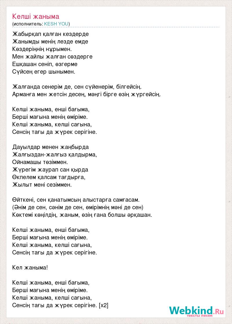 Жабырқап қалған кездерде Жанымды менің лезде емде Көздеріңнің нұрымен. Мен жайлы жалған сөздерге Ешқашан сеніп, өзгерме Сүйсең егер шынымен. Жалғанда сенерім де, сен сүйенерім, білгейсің. Арманға мен жетсін десең, мәңгі бірге өзің жүргейсің. Келші жаныма, енші бағыма, Берші мағына менің өміріме. Келші жаныма, келші сағына, Сенсің тағы да жүрек серігіне. Дауылдар менен жаңбырда Жалғыздан-жалғыз қалдырма, Ойнамашы төзіммен. Жүрегім жаурап сан қырда Өкпелем қалсам тағдырға, Жылыт мені сезіммен. Өйткені, сен қанатымсың алыстарға самғасам. (Әнім де сен, сәнім де сен, өмірімнің мәні де сен) Көктемі көңілдің, жаным, өзің ғана болшы әрқашан. Келші жаныма, енші бағыма, Берші мағына менің өміріме. Келші жаныма, келші сағына, Сенсің тағы да жүрек серігіне. Кел жаныма! Келші жаныма, енші бағыма, Берші мағына менің өміріме. Келші жаныма, келші сағына, Сенсің тағы да жүрек серігіне. [x2]