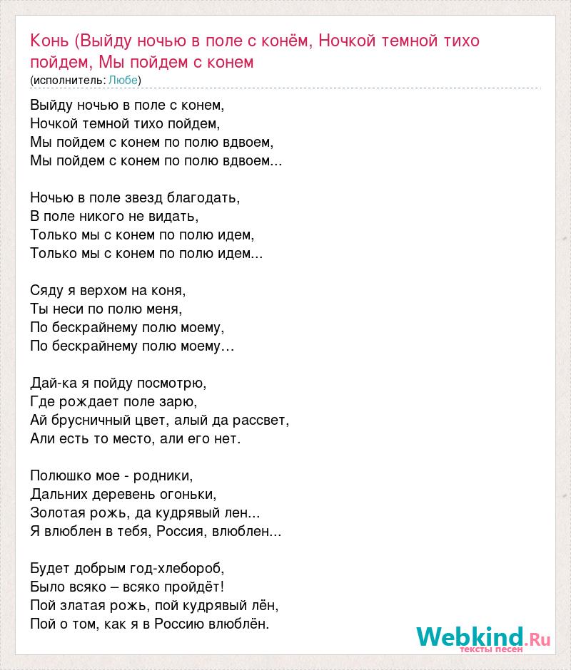 Выйду ночью в поле с конем, Ночкой темной тихо пойдем, Мы пойдем с конем по полю вдвоем, Мы пойдем с конем по полю вдвоем... Ночью в поле звезд благодать, В поле никого не видать, Только мы с конем по полю идем, Только мы с конем по полю идем... Сяду я верхом на коня, Ты неси по полю меня, По бескрайнему полю моему, По бескрайнему полю моему… Дай-ка я пойду посмотрю, Где рождает поле зарю, Ай брусничный цвет, алый да рассвет, Али есть то место, али его нет. Полюшко мое - родники, Дальних деревень огоньки, Золотая рожь, да кудрявый лен... Я влюблен в тебя, Россия, влюблен... Будет добрым год-хлебороб, Было всяко – всяко пройдёт! Пой златая рожь, пой кудрявый лён, Пой о том, как я в Россию влюблён.