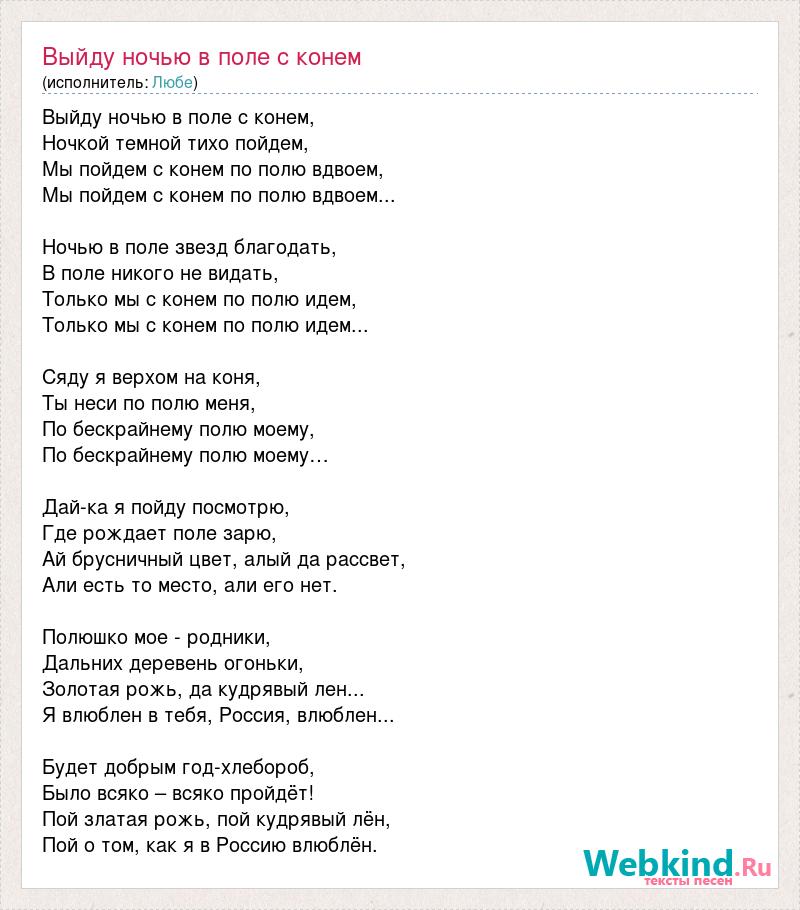 Выйду ночью в поле с конем, Ночкой темной тихо пойдем, Мы пойдем с конем по полю вдвоем, Мы пойдем с конем по полю вдвоем... Ночью в поле звезд благодать, В поле никого не видать, Только мы с конем по полю идем, Только мы с конем по полю идем... Сяду я верхом на коня, Ты неси по полю меня, По бескрайнему полю моему, По бескрайнему полю моему… Дай-ка я пойду посмотрю, Где рождает поле зарю, Ай брусничный цвет, алый да рассвет, Али есть то место, али его нет. Полюшко мое - родники, Дальних деревень огоньки, Золотая рожь, да кудрявый лен... Я влюблен в тебя, Россия, влюблен... Будет добрым год-хлебороб, Было всяко – всяко пройдёт! Пой златая рожь, пой кудрявый лён, Пой о том, как я в Россию влюблён.