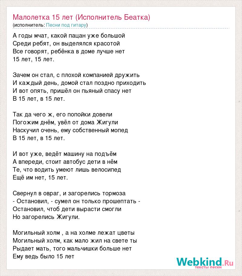 А годы мчат, какой пацан уже большой Среди ребят, он выделялся красотой Все говорят, ребёнка в доме лучше нет 15 лет, 15 лет. Зачем он стал, с плохой компанией дружить И каждый день, домой стал поздно приходить И вот опять, пришёл он пьяный спасу нет В 15 лет, в 15 лет. Так да чего ж, его попойки довели Погожим днём, увёл от дома Жигули Наскучил очень, ему собственный мопед В 15 лет, в 15 лет. И вот уже, ведёт машину на подъём А впереди, стоит автобус дети в нём Те, что водить умеют лишь велосипед Ещё им нет, 15 лет. Свернул в овраг, и загорелись тормоза - Остановил, - сумел он только прошептать - Остановил, чтоб дети вырасти смогли Но загорелись Жигули. Могильный холм , а на холме лежат цветы Могильный холм, как мало жил на свете ты Рыдает мать, того мальчишки больше нет Ему ведь было 15 лет