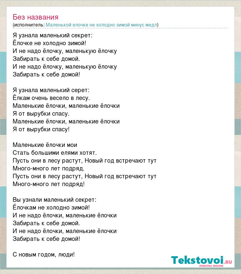 Я узнала маленький секрет: Ёлочке не холодно зимой! И не надо ёлочку, маленькую ёлочку Забирать к себе домой. И не надо ёлочку, маленькую ёлочку Забирать к себе домой! Я узнала маленький серет: Ёлкам очень весело в лесу. Маленькие ёлочки, маленькие ёлочки Я от вырубки спасу. Маленькие ёлочки, маленькие ёлочки Я от вырубки спасу! Маленькие ёлочки мои Стать большими елями хотят. Пусть они в лесу растут, Новый год встречают тут Много-много лет подряд. Пусть они в лесу растут, Новый год встречают тут Много-много лет подряд! Вы узнали маленький секрет: Ёлочкам не холодно зимой! И не надо ёлочки, маленькие ёлочки Забирать к себе домой. И не надо ёлочки, маленькие ёлочки Забирать к себе домой! С новым годом, люди!
