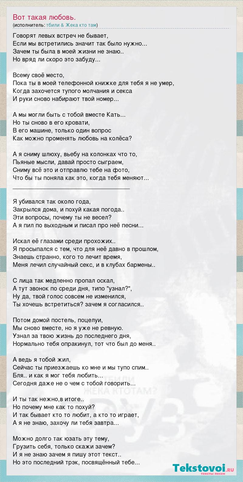 Говорят левых встреч не бывает, Если мы встретились значит так было нужно... Зачем ты была в моей жизни не знаю.. Но вряд ли скоро это забуду... Всему своё место, Пока ты в моей телефонной книжке для тебя я не умер, Когда захочется тупого молчания и секса И руки сново набирают твой номер... А мы могли быть с тобой вместе Кать... Но ты сново в его кровати, В его машине, только один вопрос Как можно променять любовь на колёса? А я сниму шлюху, вьебу на колонках что то, Пьяные мысли, давай просто сыграем, Сниму всё это и отправлю тебе на фото, Что бы ты поняла как это, когда тебя меняют... ___________________________________ Я убивался так около года, Закрылся дома, и похуй какая погода.. Эти вопросы, почему ты не весел? А я пил по выходным и писал про неё песни... Искал её глазами среди прохожих.. Я просыпался с тем, что для неё давно в прошлом, Знаешь странно, кого то лечит время, Меня лечил случайный секс, и в клубах бармены.. С лица так медленно пропал оскал, А тут звонок по среди дня, типо "узнал?", Ну да, твой голос совсем не изменился, Ты хочешь встретиться? зачем я согласился.. Потом домой постель, поцелуи, Мы сново вместе, но я уже не ревную. Узнал за твою жизнь до последнего дня, Нормально тебя опракинул, тот что был до меня.. А ведь я тобой жил, Сейчас ты приезжаешь ко мне и мы тупо спим.. Бля.. и как я мог тебя любить... Сегодня даже не о чем с тобой говорить... И ты так нежно,в итоге.. Но почему мне как то похуй? И так бывает кто то любит, а кто то играет, А я не знаю, захочу ли тебя завтра... Можно долго так юзать эту тему, Грузить себя, только скажи зачем? И я не знаю зачем я пишу этот текст.. Но это последний трэк, посвящённый тебе...