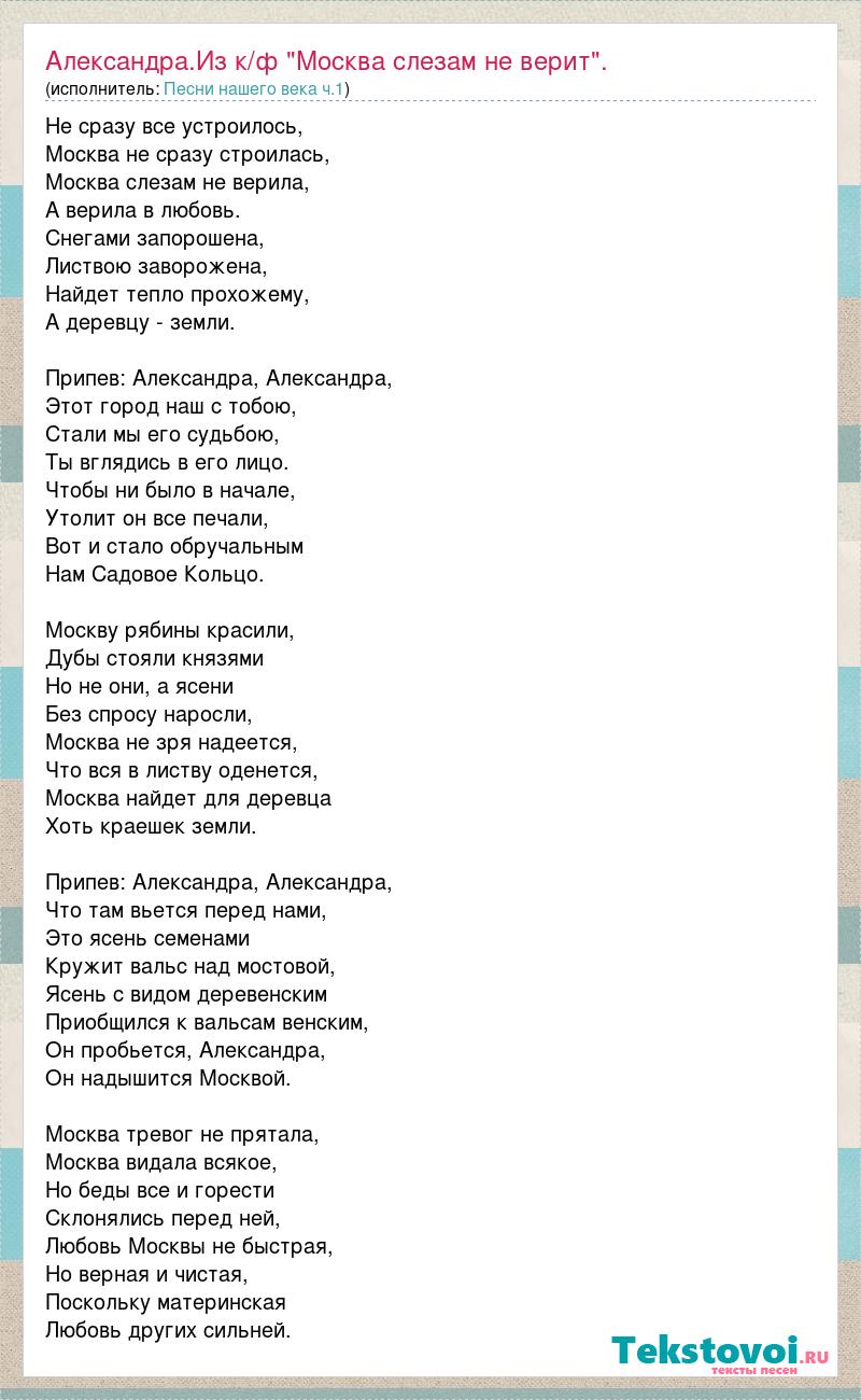 Не сразу все устроилось, Москва не сразу строилась, Москва слезам не верила, А верила в любовь. Снегами запорошена, Листвою заворожена, Найдет тепло прохожему, А деревцу - земли. Припев: Александра, Александра, Этот город наш с тобою, Стали мы его судьбою, Ты вглядись в его лицо. Чтобы ни было в начале, Утолит он все печали, Вот и стало обручальным Нам Садовое Кольцо. Москву рябины красили, Дубы стояли князями Но не они, а ясени Без спросу наросли, Москва не зря надеется, Что вся в листву оденется, Москва найдет для деревца Хоть краешек земли. Припев: Александра, Александра, Что там вьется перед нами, Это ясень семенами Кружит вальс над мостовой, Ясень с видом деревенским Приобщился к вальсам венским, Он пробьется, Александра, Он надышится Москвой. Москва тревог не прятала, Москва видала всякое, Но беды все и горести Склонялись перед ней, Любовь Москвы не быстрая, Но верная и чистая, Поскольку материнская Любовь других сильней.