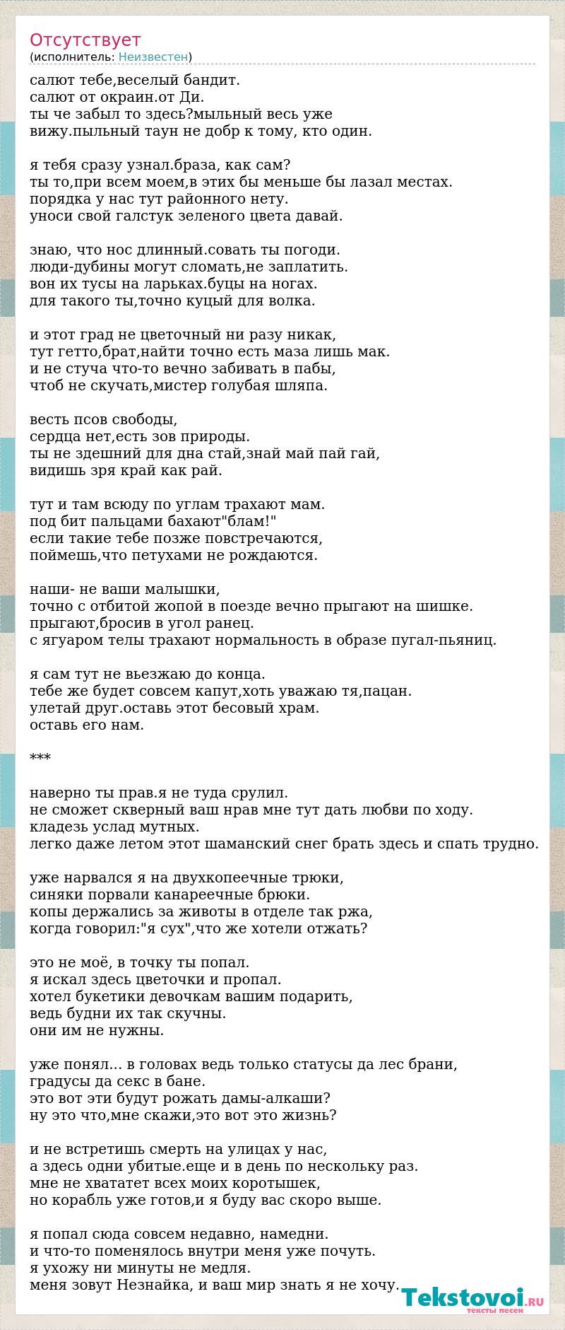 салют тебе,веселый бандит. салют от окраин.от Ди. ты че забыл то здесь?мыльный весь уже вижу.пыльный таун не добр к тому, кто один. я тебя сразу узнал.браза, как сам? ты то,при всем моем,в этих бы меньше бы лазал местах. порядка у нас тут районного нету. уноси свой галстук зеленого цвета давай. знаю, что нос длинный.совать ты погоди. люди-дубины могут сломать,не заплатить. вон их тусы на ларьках.буцы на ногах. для такого ты,точно куцый для волка. и этот град не цветочный ни разу никак, тут гетто,брат,найти точно есть маза лишь мак. и не стуча что-то вечно забивать в пабы, чтоб не скучать,мистер голубая шляпа. весть псов свободы, сердца нет,есть зов природы. ты не здешний для дна стай,знай май пай гай, видишь зря край как рай. тут и там всюду по углам трахают мам. под бит пальцами бахают"блам!" если такие тебе позже повстречаются, поймешь,что петухами не рождаются. наши- не ваши малышки, точно с отбитой жопой в поезде вечно прыгают на шишке. прыгают,бросив в угол ранец. с ягуаром телы трахают нормальность в образе пугал-пьяниц. я сам тут не вьезжаю до конца. тебе же будет совсем капут,хоть уважаю тя,пацан. улетай друг.оставь этот бесовый храм. оставь его нам. *** наверно ты прав.я не туда срулил. не сможет скверный ваш нрав мне тут дать любви по ходу. кладезь услад мутных. легко даже летом этот шаманский снег брать здесь и спать трудно. уже нарвался я на двухкопеечные трюки, синяки порвали канареечные брюки. копы держались за животы в отделе так ржа, когда говорил:"я сух",что же хотели отжать? это не моё, в точку ты попал. я искал здесь цветочки и пропал. хотел букетики девочкам вашим подарить, ведь будни их так скучны. они им не нужны. уже понял... в головах ведь только статусы да лес брани, градусы да секс в бане. это вот эти будут рожать дамы-алкаши? ну это что,мне скажи,это вот это жизнь? и не встретишь смерть на улицах у нас, а здесь одни убитые.еще и в день по нескольку раз. мне не хвататет всех моих коротышек, но корабль уже готов,и я буду вас скоро выше. я попал сюда совсем недавно, намедни. и что-то поменялось внутри меня уже почуть. я ухожу ни минуты не медля. меня зовут Незнайка, и ваш мир знать я не хочу.