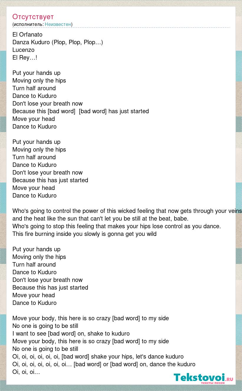 El Orfanato Danza Kuduro (Plop, Plop, Plop…) Lucenzo El Rey…! Put your hands up Moving only the hips Turn half around Dance to Kuduro Don't lose your breath now Because this [bad word] [bad word] has just started Move your head Dance to Kuduro Put your hands up Moving only the hips Turn half around Dance to Kuduro Don't lose your breath now Because this has just started Move your head Dance to Kuduro Who's going to control the power of this wicked feeling that now gets through your veins and the heat like the sun that can't let you be still at the beat, babe. Who's going to stop this feeling that makes your hips lose control as you dance. This fire burning inside you slowly is gonna get you wild Put your hands up Moving only the hips Turn half around Dance to Kuduro Don't lose your breath now Because this has just started Move your head Dance to Kuduro Move your body, this here is so crazy Morena, come to my side No one is going to be still I want to see you, come on, shake to kuduro Move your body, this here is so crazy Morena, come to my side No one is going to be still Oi, oi, oi, oi, oi, oi, oi… Come shake your hips, let's dance kuduro Oi, oi, oi, oi, oi, oi, oi… Brunette or blonde, come on, dance the kuduro Oi, oi, oi…
