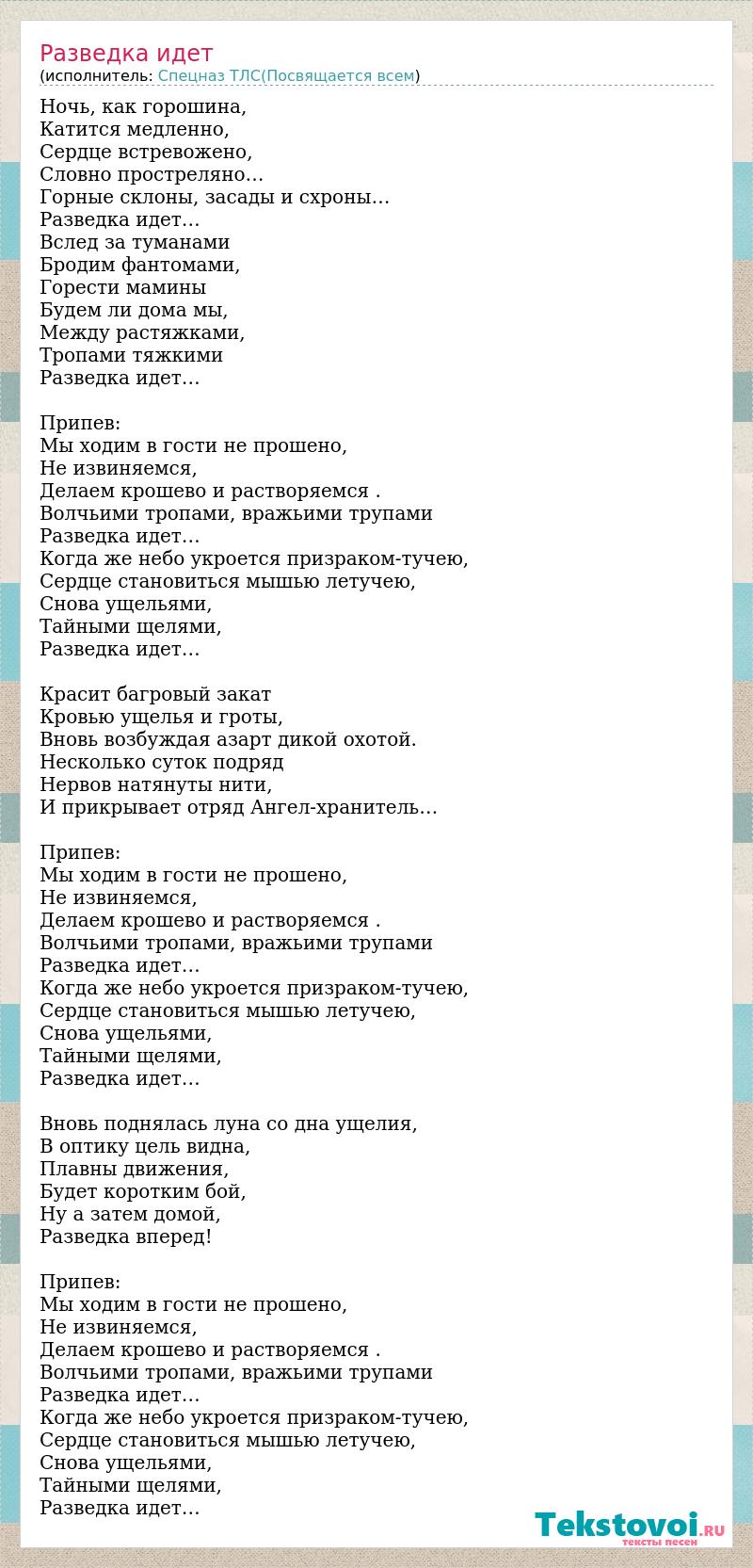 Ночь, как горошина, Катится медленно, Сердце встревожено, Словно простреляно… Горные склоны, засады и схроны… Разведка идет… Вслед за туманами Бродим фантомами, Горести мамины Будем ли дома мы, Между растяжками, Тропами тяжкими Разведка идет… Припев: Мы ходим в гости не прошено, Не извиняемся, Делаем крошево и растворяемся . Волчьими тропами, вражьими трупами Разведка идет… Когда же небо укроется призраком-тучею, Сердце становиться мышью летучею, Снова ущельями, Тайными щелями, Разведка идет… Красит багровый закат Кровью ущелья и гроты, Вновь возбуждая азарт дикой охотой. Несколько суток подряд Нервов натянуты нити, И прикрывает отряд Ангел-хранитель… Припев: Мы ходим в гости не прошено, Не извиняемся, Делаем крошево и растворяемся . Волчьими тропами, вражьими трупами Разведка идет… Когда же небо укроется призраком-тучею, Сердце становиться мышью летучею, Снова ущельями, Тайными щелями, Разведка идет… Вновь поднялась луна со дна ущелия, В оптику цель видна, Плавны движения, Будет коротким бой, Ну а затем домой, Разведка вперед! Припев: Мы ходим в гости не прошено, Не извиняемся, Делаем крошево и растворяемся . Волчьими тропами, вражьими трупами Разведка идет… Когда же небо укроется призраком-тучею, Сердце становиться мышью летучею, Снова ущельями, Тайными щелями, Разведка идет…