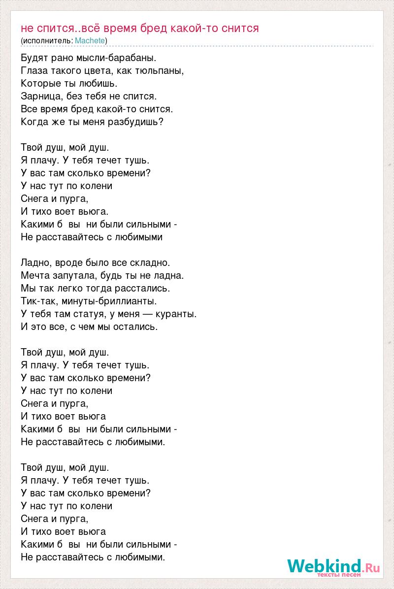 Будят рано мысли-барабаны. Глаза такого цвета, как тюльпаны, Которые ты любишь. Зарница, без тебя не спится. Все время бред какой-то снится. Когда же ты меня разбудишь? Твой душ, мой душ. Я плачу. У тебя течет тушь. У вас там сколько времени? У нас тут по колени Снега и пурга, И тихо воет вьюга. Какими б вы ни были сильными - Не расставайтесь с любимыми Ладно, вроде было все складно. Мечта запутала, будь ты не ладна. Мы так легко тогда расстались. Тик-так, минуты-бриллианты. У тебя там статуя, у меня — куранты. И это все, с чем мы остались. Твой душ, мой душ. Я плачу. У тебя течет тушь. У вас там сколько времени? У нас тут по колени Снега и пурга, И тихо воет вьюга Какими б вы ни были сильными - Не расставайтесь с любимыми. Твой душ, мой душ. Я плачу. У тебя течет тушь. У вас там сколько времени? У нас тут по колени Снега и пурга, И тихо воет вьюга Какими б вы ни были сильными - Не расставайтесь с любимыми.