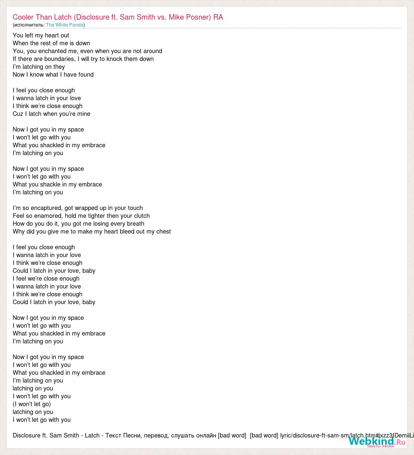 You left my heart out When the rest of me is down You, you enchanted me, even when you are not around If there are boundaries, I will try to knock them down I’m latching on they Now I know what I have found I feel you close enough I wanna latch in your love I think we’re close enough Cuz I latch when you’re mine Now I got you in my space I won’t let go with you What you shackled in my embrace I’m latching on you Now I got you in my space I won’t let go with you What you shackle in my embrace I’m latching on you I’m so encaptured, got wrapped up in your touch Feel so enamored, hold me tighter then your clutch How do you do it, you got me losing every breath Why did you give me to make my heart bleed out my chest I feel you close enough I wanna latch in your love I think we’re close enough Could I latch in your love, baby I feel we’re close enough I wanna latch in your love I think we’re close enough Could I latch in your love, baby Now I got you in my space I won’t let go with you What you shackled in my embrace I’m latching on you Now I got you in my space I won’t let go with you What you shackled in my embrace I’m latching on you latching on you I won’t let go with you (I won’t let go) latching on you I won’t let go with you Disclosure ft. Sam Smith - Latch - Текст Песни, перевод, слушать онлайн [bad word] [bad word] lyric/disclosure-ft-sam-sm/latch.htm#ixzz3IDemiiLi