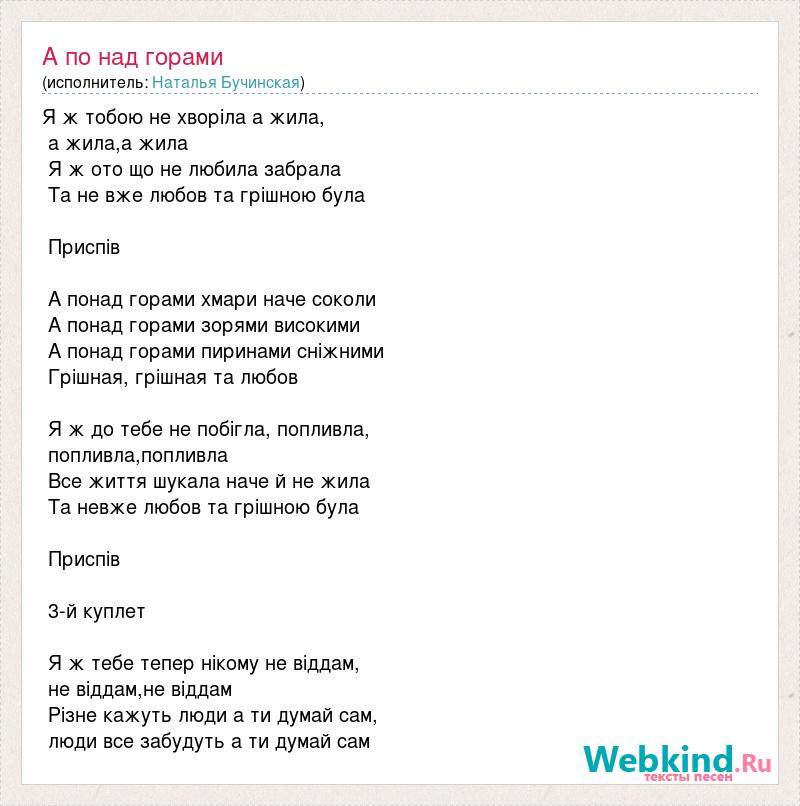 Я ж тобою не хворіла а жила, а жила,а жила Я ж ото що не любила забрала Та не вже любов та грішною була Приспів А понад горами хмари наче соколи А понад горами зорями високими А понад горами пиринами сніжними Грішная, грішная та любов Я ж до тебе не побігла, попливла, попливла,попливла Все життя шукала наче й не жила Та невже любов та грішною була Приспів 3-й куплет Я ж тебе тепер нікому не віддам, не віддам,не віддам Різне кажуть люди а ти думай сам, люди все забудуть а ти думай сам
