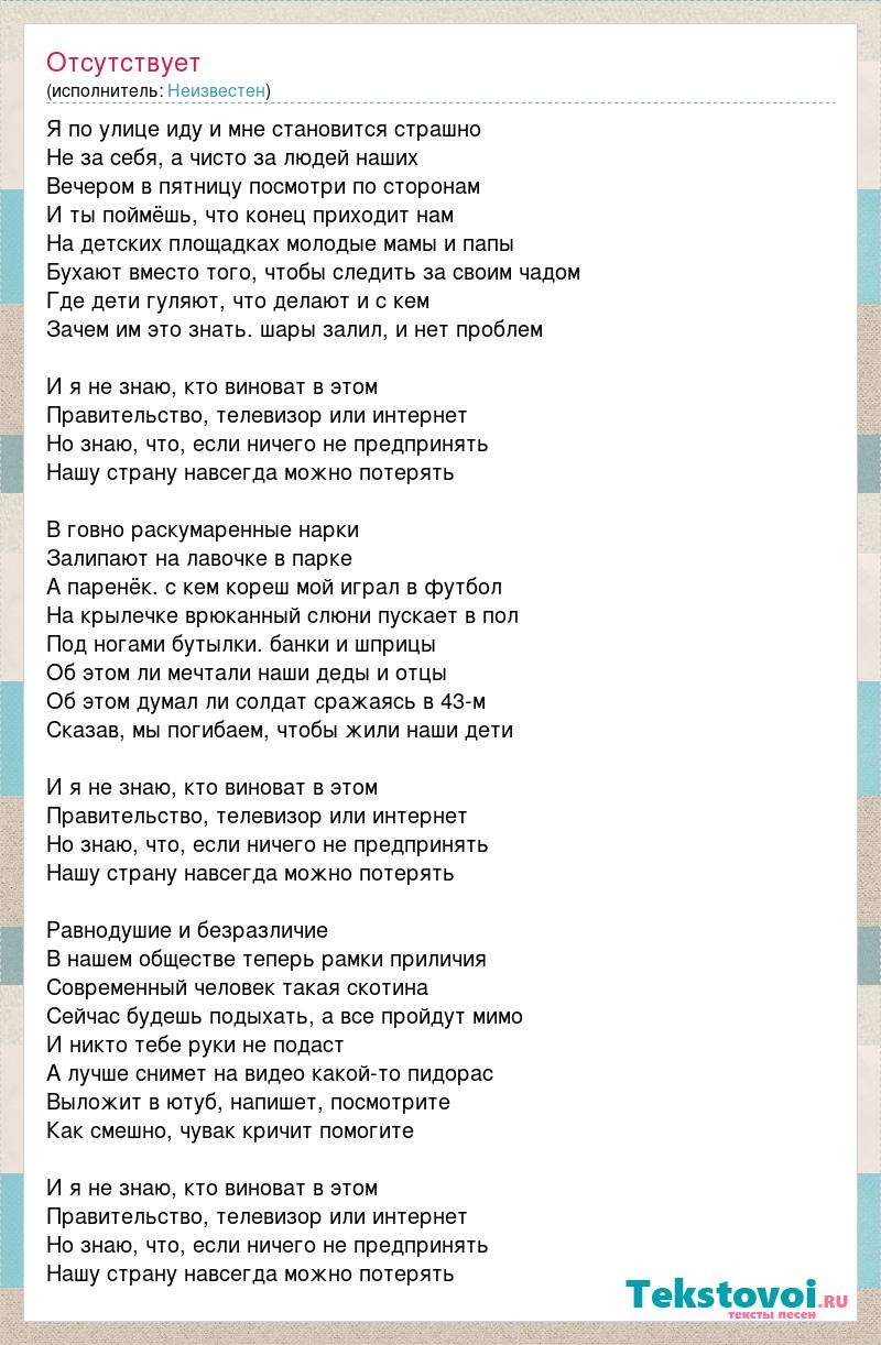 Я по улице иду и мне становится страшно Не за себя, а чисто за людей наших Вечером в пятницу посмотри по сторонам И ты поймёшь, что конец приходит нам На детских площадках молодые мамы и папы Бухают вместо того, чтобы следить за своим чадом Где дети гуляют, что делают и с кем Зачем им это знать. шары залил, и нет проблем И я не знаю, кто виноват в этом Правительство, телевизор или интернет Но знаю, что, если ничего не предпринять Нашу страну навсегда можно потерять В говно раскумаренные нарки Залипают на лавочке в парке А паренёк. с кем кореш мой играл в футбол На крылечке врюканный слюни пускает в пол Под ногами бутылки. банки и шприцы Об этом ли мечтали наши деды и отцы Об этом думал ли солдат сражаясь в 43-м Сказав, мы погибаем, чтобы жили наши дети И я не знаю, кто виноват в этом Правительство, телевизор или интернет Но знаю, что, если ничего не предпринять Нашу страну навсегда можно потерять Равнодушие и безразличие В нашем обществе теперь рамки приличия Современный человек такая скотина Сейчас будешь подыхать, а все пройдут мимо И никто тебе руки не подаст А лучше снимет на видео какой-то пидорас Выложит в ютуб, напишет, посмотрите Как смешно, чувак кричит помогите И я не знаю, кто виноват в этом Правительство, телевизор или интернет Но знаю, что, если ничего не предпринять Нашу страну навсегда можно потерять