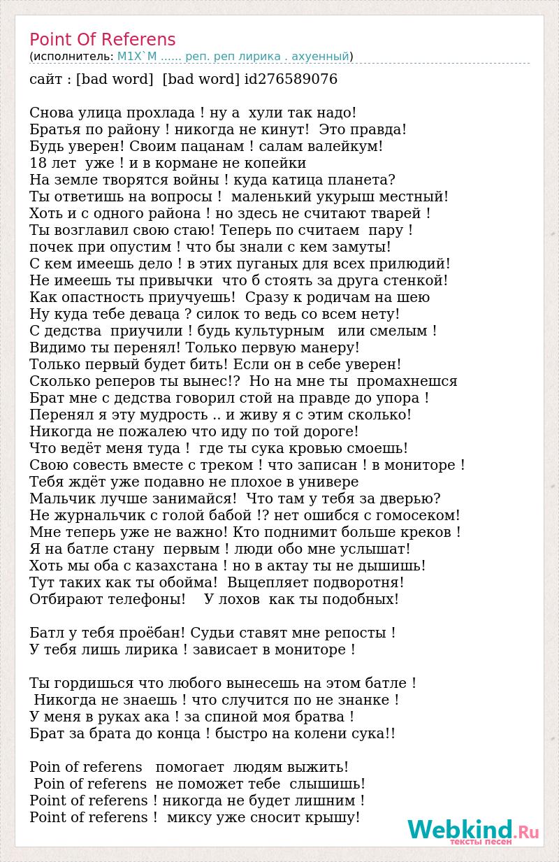 сайт : [bad word] [bad word] id276589076 Снова улица прохлада ! ну а хули так надо! Братья по району ! никогда не кинут! Это правда! Будь уверен! Своим пацанам ! салам валейкум! 18 лет уже ! и в кормане не копейки На земле творятся войны ! куда катица планета? Ты ответишь на вопросы ! маленький укурыш местный! Хоть и с одного района ! но здесь не считают тварей ! Ты возглавил свою стаю! Теперь по считаем пару ! почек при опустим ! что бы знали с кем замуты! С кем имеешь дело ! в этих пуганых для всех прилюдий! Не имеешь ты привычки что б стоять за друга стенкой! Как опастность приучуешь! Сразу к родичам на шею Ну куда тебе деваца ? силок то ведь со всем нету! С дедства приучили ! будь культурным или смелым ! Видимо ты перенял! Только первую манеру! Только первый будет бить! Если он в себе уверен! Сколько реперов ты вынес!? Но на мне ты промахнешся Брат мне с дедства говорил стой на правде до упора ! Перенял я эту мудрость .. и живу я с этим сколько! Никогда не пожалею что иду по той дороге! Что ведёт меня туда ! где ты сука кровью смоешь! Свою совесть вместе с треком ! что записан ! в мониторе ! Тебя ждёт уже подавно не плохое в универе Мальчик лучше занимайся! Что там у тебя за дверью? Не журнальчик с голой бабой !? нет ошибся с гомосеком! Мне теперь уже не важно! Кто поднимит больше креков ! Я на батле стану первым ! люди обо мне услышат! Хоть мы оба с казахстана ! но в актау ты не дышишь! Тут таких как ты обойма! Выцепляет подворотня! Отбирают телефоны! У лохов как ты подобных! Батл у тебя проёбан! Судьи ставят мне репосты ! У тебя лишь лирика ! зависает в мониторе ! Ты гордишься что любого вынесешь на этом батле ! Никогда не знаешь ! что случится по не знанке ! У меня в руках ака ! за спиной моя братва ! Брат за брата до конца ! быстро на колени сука!! Poin of referens помогает людям выжить! Poin of referens не поможет тебе слышишь! Point of referens ! никогда не будет лишним ! Point of referens ! миксу уже сносит крышу!