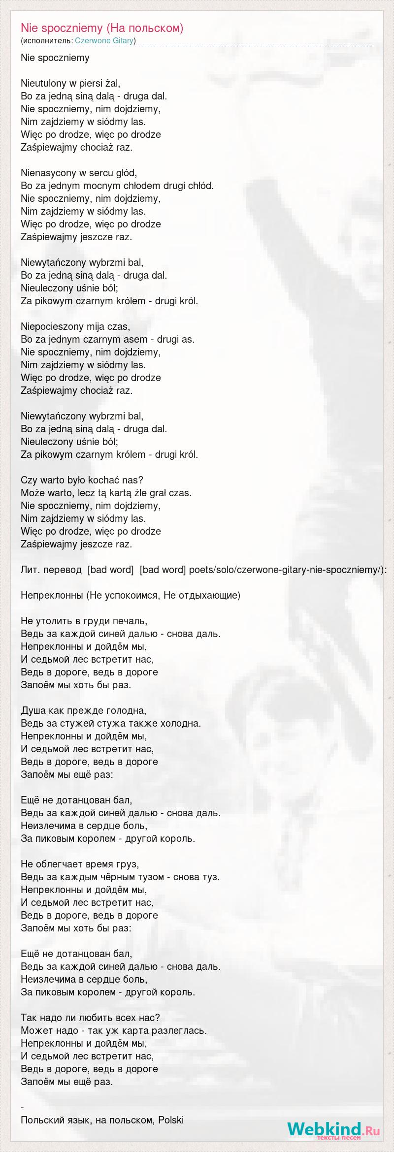 Nie spoczniemy Nieutulony w piersi żal, Bo za jedną siną dalą - druga dal. Nie spoczniemy, nim dojdziemy, Nim zajdziemy w siódmy las. Więc po drodze, więc po drodze Zaśpiewajmy chociaż raz. Nienasycony w sercu głód, Bo za jednym mocnym chłodem drugi chłód. Nie spoczniemy, nim dojdziemy, Nim zajdziemy w siódmy las. Więc po drodze, więc po drodze Zaśpiewajmy jeszcze raz. Niewytańczony wybrzmi bal, Bo za jedną siną dalą - druga dal. Nieuleczony uśnie ból; Za pikowym czarnym królem - drugi król. Niepocieszony mija czas, Bo za jednym czarnym asem - drugi as. Nie spoczniemy, nim dojdziemy, Nim zajdziemy w siódmy las. Więc po drodze, więc po drodze Zaśpiewajmy chociaż raz. Niewytańczony wybrzmi bal, Bo za jedną siną dalą - druga dal. Nieuleczony uśnie ból; Za pikowym czarnym królem - drugi król. Czy warto było kochać nas? Może warto, lecz tą kartą źle grał czas. Nie spoczniemy, nim dojdziemy, Nim zajdziemy w siódmy las. Więc po drodze, więc po drodze Zaśpiewajmy jeszcze raz. Лит. перевод [bad word] [bad word] poets/solo/czerwone-gitary-nie-spoczniemy/): Непреклонны (Не успокоимся, Не отдыхающие) Не утолить в груди печаль, Ведь за каждой синей далью - снова даль. Непреклонны и дойдём мы, И седьмой лес встретит нас, Ведь в дороге, ведь в дороге Запоём мы хоть бы раз. Душа как прежде голодна, Ведь за стужей стужа также холодна. Непреклонны и дойдём мы, И седьмой лес встретит нас, Ведь в дороге, ведь в дороге Запоём мы ещё раз: Ещё не дотанцован бал, Ведь за каждой синей далью - снова даль. Неизлечима в сердце боль, За пиковым королем - другой король. Не облегчает время груз, Ведь за каждым чёрным тузом - снова туз. Непреклонны и дойдём мы, И седьмой лес встретит нас, Ведь в дороге, ведь в дороге Запоём мы хоть бы раз: Ещё не дотанцован бал, Ведь за каждой синей далью - снова даль. Неизлечима в сердце боль, За пиковым королем - другой король. Так надо ли любить всех нас? Может надо - так уж карта разлеглась. Непреклонны и дойдём мы, И седьмой лес встретит нас, Ведь в дороге, ведь в дороге Запоём мы ещё раз. - Польский язык, на польском, Polski