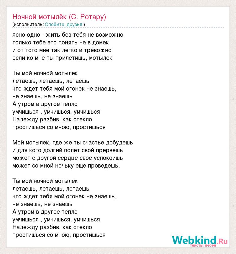 ясно одно - жить без тебя не возможно только тебе это понять не в домек и от того мне так легко и тревожно если ко мне ты прилетишь, мотылек Ты мой ночной мотылек летаешь, летаешь, летаешь что ждет тебя мой огонек не знаешь, не знаешь, не знаешь А утром в другое тепло умчишься , умчишься, умчишься Надежду разбив, как стекло простишься со мною, простишься Мой мотылек, где же ты счастье добудешь и для кого долгий полет свой прервешь может с другой сердце свое успокоишь может со мной ночьку еще проведешь. Ты мой ночной мотылек летаешь, летаешь, летаешь что ждет тебя мой огонек не знаешь, не знаешь, не знаешь А утром в другое тепло умчишься , умчишься, умчишься Надежду разбив, как стекло простишься со мною, простишься