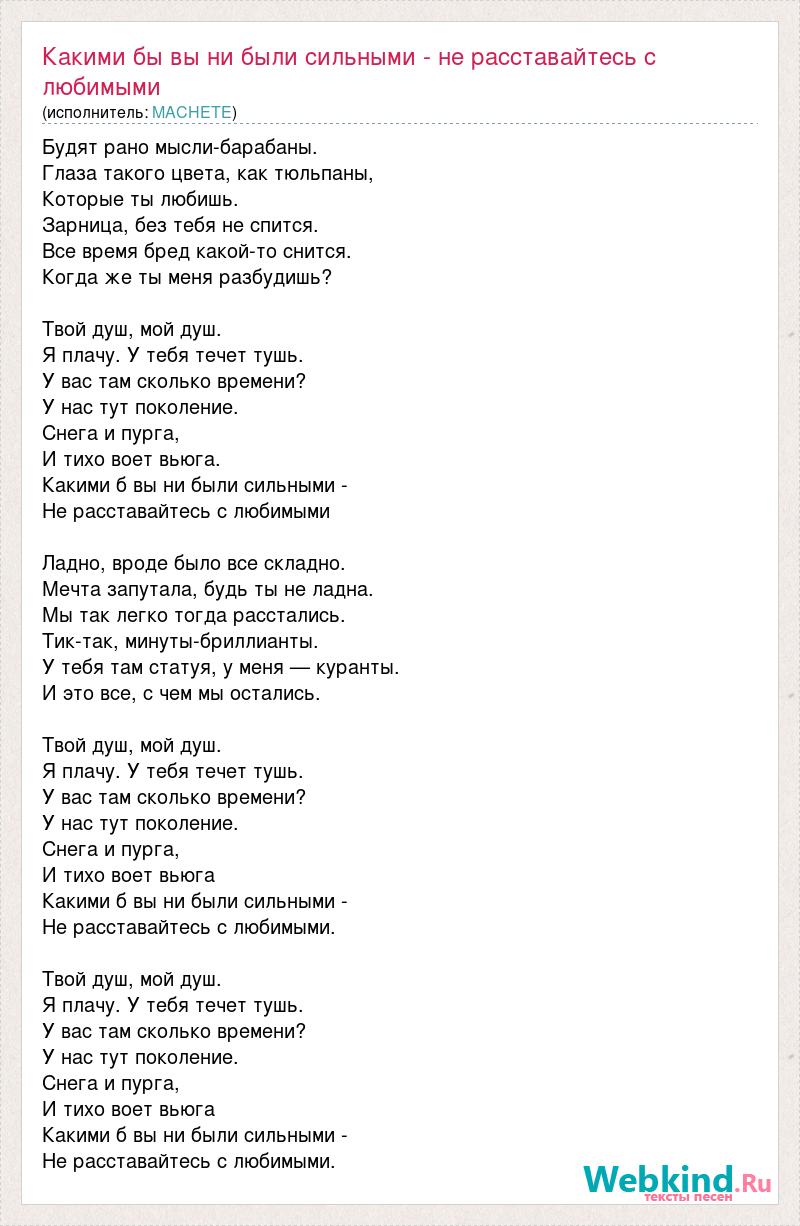 Будят рано мысли-барабаны. Глаза такого цвета, как тюльпаны, Которые ты любишь. Зарница, без тебя не спится. Все время бред какой-то снится. Когда же ты меня разбудишь? Твой душ, мой душ. Я плачу. У тебя течет тушь. У вас там сколько времени? У нас тут поколение. Снега и пурга, И тихо воет вьюга. Какими б вы ни были сильными - Не расставайтесь с любимыми Ладно, вроде было все складно. Мечта запутала, будь ты не ладна. Мы так легко тогда расстались. Тик-так, минуты-бриллианты. У тебя там статуя, у меня — куранты. И это все, с чем мы остались. Твой душ, мой душ. Я плачу. У тебя течет тушь. У вас там сколько времени? У нас тут поколение. Снега и пурга, И тихо воет вьюга Какими б вы ни были сильными - Не расставайтесь с любимыми. Твой душ, мой душ. Я плачу. У тебя течет тушь. У вас там сколько времени? У нас тут поколение. Снега и пурга, И тихо воет вьюга Какими б вы ни были сильными - Не расставайтесь с любимыми.