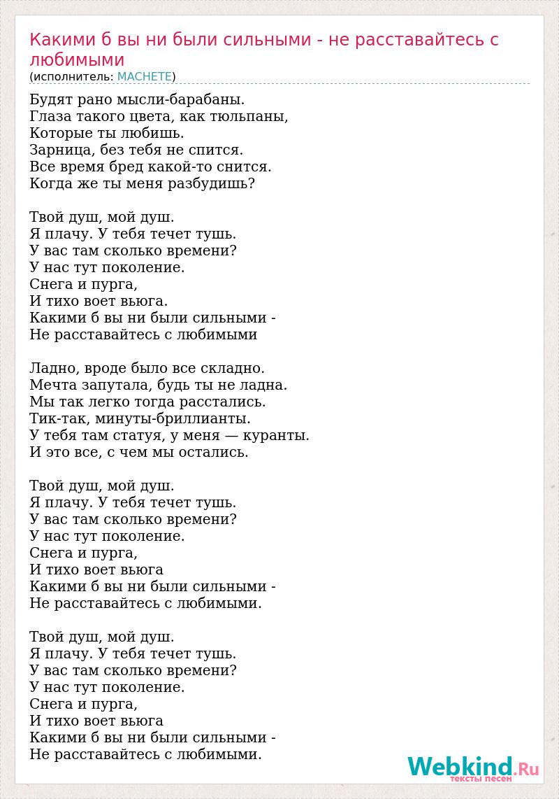 Будят рано мысли-барабаны. Глаза такого цвета, как тюльпаны, Которые ты любишь. Зарница, без тебя не спится. Все время бред какой-то снится. Когда же ты меня разбудишь? Твой душ, мой душ. Я плачу. У тебя течет тушь. У вас там сколько времени? У нас тут поколение. Снега и пурга, И тихо воет вьюга. Какими б вы ни были сильными - Не расставайтесь с любимыми Ладно, вроде было все складно. Мечта запутала, будь ты не ладна. Мы так легко тогда расстались. Тик-так, минуты-бриллианты. У тебя там статуя, у меня — куранты. И это все, с чем мы остались. Твой душ, мой душ. Я плачу. У тебя течет тушь. У вас там сколько времени? У нас тут поколение. Снега и пурга, И тихо воет вьюга Какими б вы ни были сильными - Не расставайтесь с любимыми. Твой душ, мой душ. Я плачу. У тебя течет тушь. У вас там сколько времени? У нас тут поколение. Снега и пурга, И тихо воет вьюга Какими б вы ни были сильными - Не расставайтесь с любимыми.