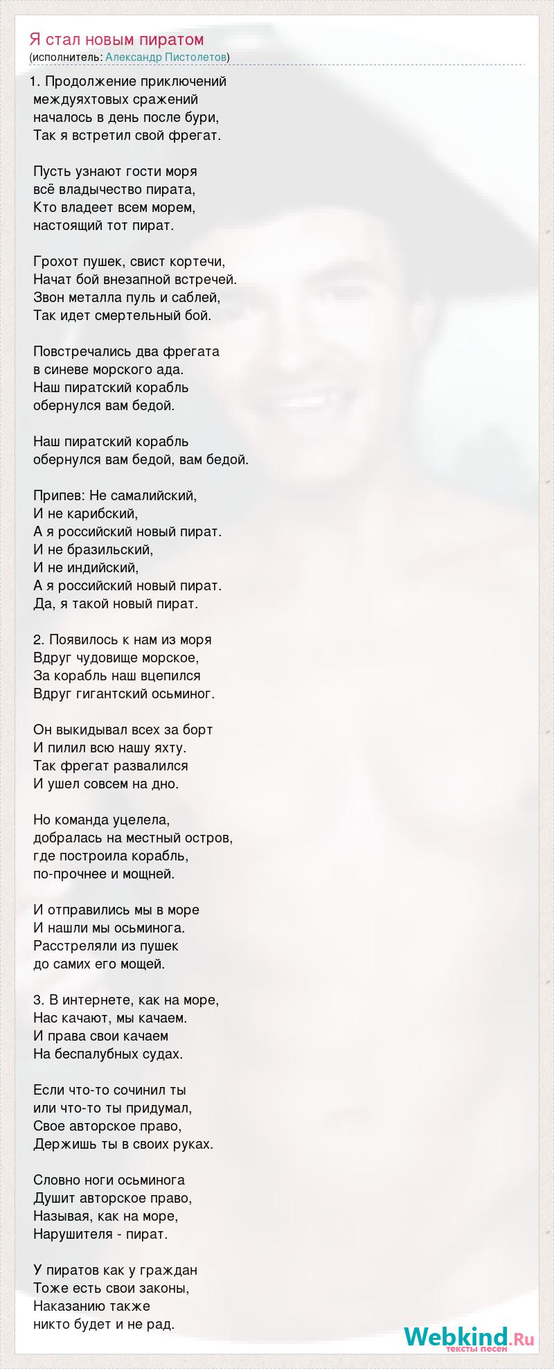 1. Продолжение приключений междуяхтовых сражений началось в день после бури, Так я встретил свой фрегат. Пусть узнают гости моря всё владычество пирата, Кто владеет всем морем, настоящий тот пират. Грохот пушек, свист кортечи, Начат бой внезапной встречей. Звон металла пуль и саблей, Так идет смертельный бой. Повстречались два фрегата в синеве морского ада. Наш пиратский корабль обернулся вам бедой. Наш пиратский корабль обернулся вам бедой, вам бедой. Припев: Не самалийский, И не карибский, А я российский новый пират. И не бразильский, И не индийский, А я российский новый пират. Да, я такой новый пират. 2. Появилось к нам из моря Вдруг чудовище морское, За корабль наш вцепился Вдруг гигантский осьминог. Он выкидывал всех за борт И пилил всю нашу яхту. Так фрегат развалился И ушел совсем на дно. Но команда уцелела, добралась на местный остров, где построила корабль, по-прочнее и мощней. И отправились мы в море И нашли мы осьминога. Расстреляли из пушек до самих его мощей. 3. В интернете, как на море, Нас качают, мы качаем. И права свои качаем На беспалубных судах. Если что-то сочинил ты или что-то ты придумал, Свое авторское право, Держишь ты в своих руках. Словно ноги осьминога Душит авторское право, Называя, как на море, Нарушителя - пират. У пиратов как у граждан Тоже есть свои законы, Наказанию также никто будет и не рад.