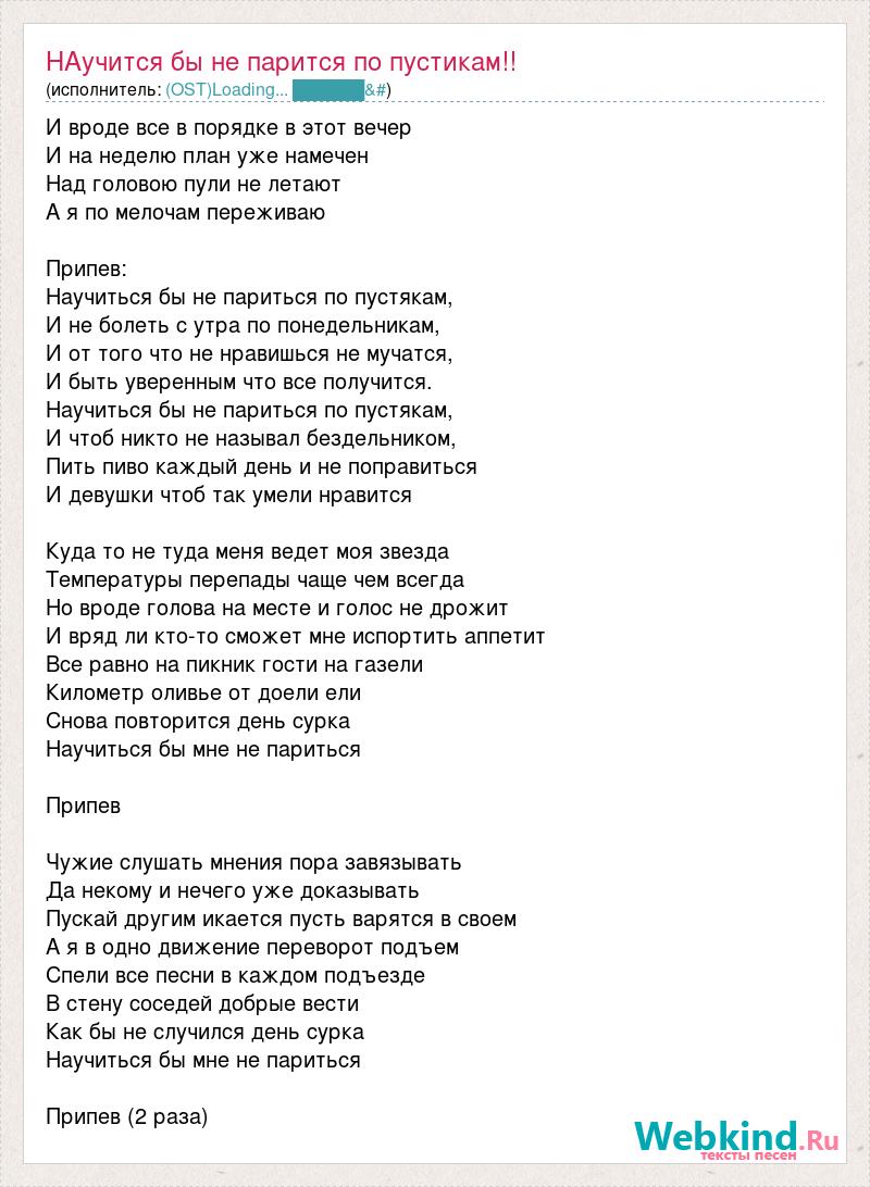 И вроде все в порядке в этот вечер И на неделю план уже намечен Над головою пули не летают А я по мелочам переживаю Припев: Научиться бы не париться по пустякам, И не болеть с утра по понедельникам, И от того что не нравишься не мучатся, И быть уверенным что все получится. Научиться бы не париться по пустякам, И чтоб никто не называл бездельником, Пить пиво каждый день и не поправиться И девушки чтоб так умели нравится Куда то не туда меня ведет моя звезда Температуры перепады чаще чем всегда Но вроде голова на месте и голос не дрожит И вряд ли кто-то сможет мне испортить аппетит Все равно на пикник гости на газели Километр оливье от доели ели Снова повторится день сурка Научиться бы мне не париться Припев Чужие слушать мнения пора завязывать Да некому и нечего уже доказывать Пускай другим икается пусть варятся в своем А я в одно движение переворот подъем Спели все песни в каждом подъезде В стену соседей добрые вести Как бы не случился день сурка Научиться бы мне не париться Припев (2 раза)