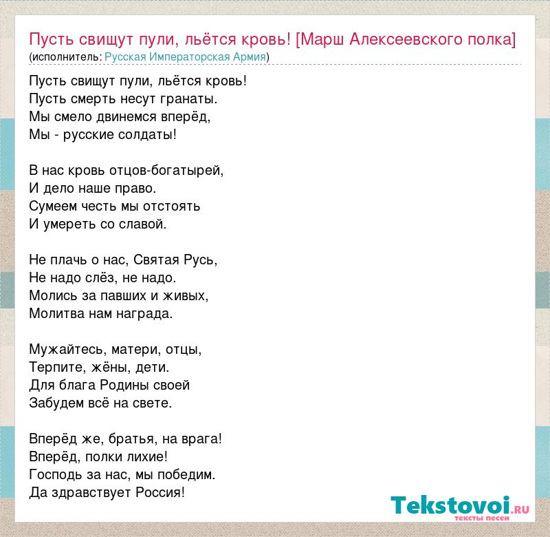 Пусть свищут пули, льётся кровь! Пусть смерть несут гранаты. Мы смело двинемся вперёд, Мы - русские солдаты! В нас кровь отцов-богатырей, И дело наше право. Сумеем честь мы отстоять И умереть со славой. Не плачь о нас, Святая Русь, Не надо слёз, не надо. Молись за павших и живых, Молитва нам награда. Мужайтесь, матери, отцы, Терпите, жёны, дети. Для блага Родины своей Забудем всё на свете. Вперёд же, братья, на врага! Вперёд, полки лихие! Господь за нас, мы победим. Да здравствует Россия!