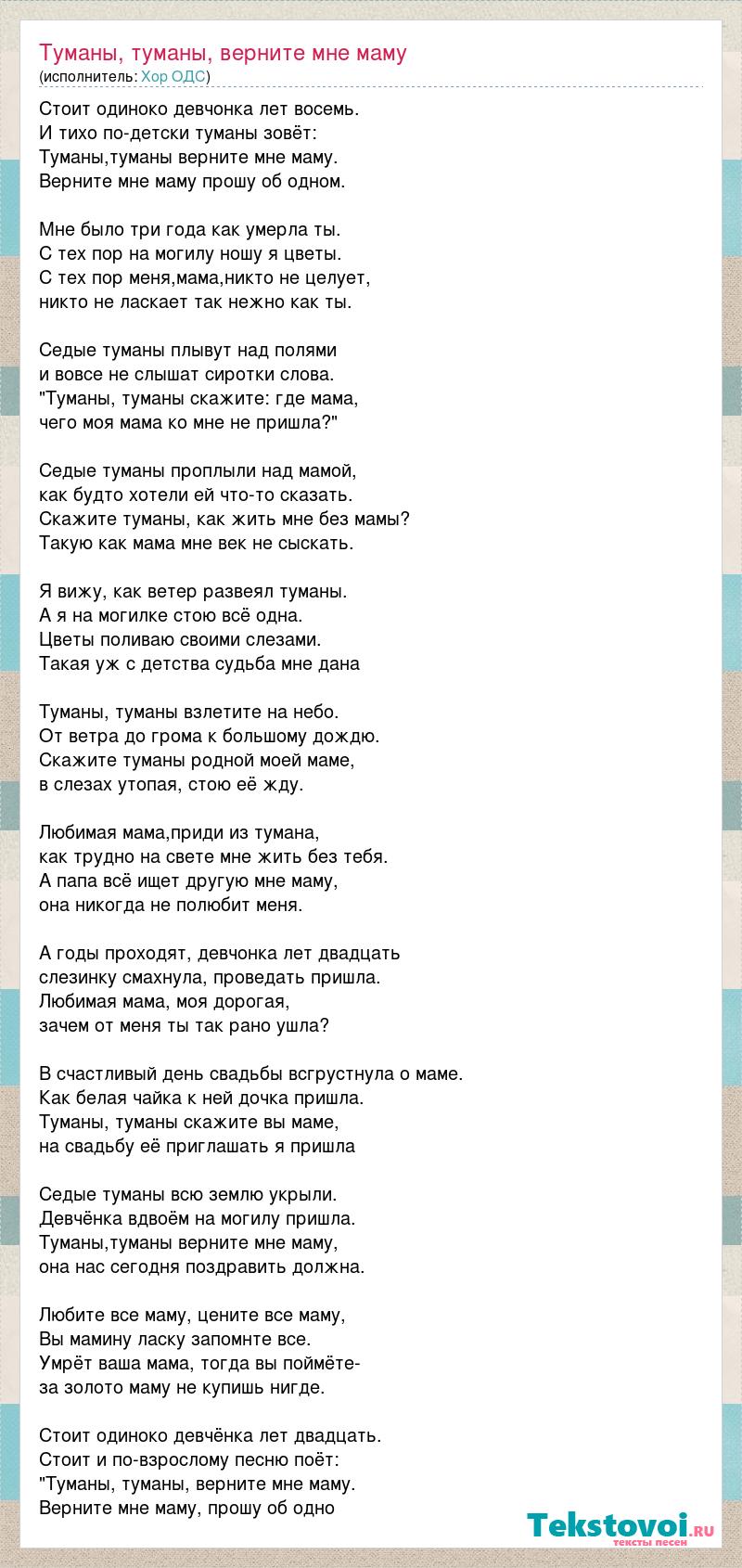 Стоит одиноко девчонка лет восемь. И тихо по-детски туманы зовёт: Туманы,туманы верните мне маму. Верните мне маму прошу об одном. Мне было три года как умерла ты. С тех пор на могилу ношу я цветы. С тех пор меня,мама,никто не целует, никто не ласкает так нежно как ты. Седые туманы плывут над полями и вовсе не слышат сиротки слова. "Туманы, туманы скажите: где мама, чего моя мама ко мне не пришла?" Седые туманы проплыли над мамой, как будто хотели ей что-то сказать. Скажите туманы, как жить мне без мамы? Такую как мама мне век не сыскать. Я вижу, как ветер развеял туманы. А я на могилке стою всё одна. Цветы поливаю своими слезами. Такая уж с детства судьба мне дана Туманы, туманы взлетите на небо. От ветра до грома к большому дождю. Скажите туманы родной моей маме, в слезах утопая, стою её жду. Любимая мама,приди из тумана, как трудно на свете мне жить без тебя. А папа всё ищет другую мне маму, она никогда не полюбит меня. А годы проходят, девчонка лет двадцать слезинку смахнула, проведать пришла. Любимая мама, моя дорогая, зачем от меня ты так рано ушла? В счастливый день свадьбы всгрустнула о маме. Как белая чайка к ней дочка пришла. Туманы, туманы скажите вы маме, на свадьбу её приглашать я пришла Седые туманы всю землю укрыли. Девчёнка вдвоём на могилу пришла. Туманы,туманы верните мне маму, она нас сегодня поздравить должна. Любите все маму, цените все маму, Вы мамину ласку запомнте все. Умрёт ваша мама, тогда вы поймёте- за золото маму не купишь нигде. Стоит одиноко девчёнка лет двадцать. Стоит и по-взрослому песню поёт: "Туманы, туманы, верните мне маму. Верните мне маму, прошу об одно