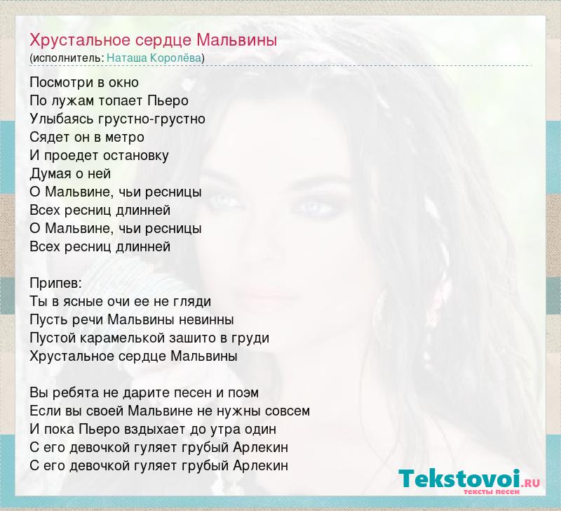 Посмотри в окно По лужам топает Пьеро Улыбаясь грустно-грустно Сядет он в метро И проедет остановку Думая о ней О Мальвине, чьи ресницы Всех ресниц длинней О Мальвине, чьи ресницы Всех ресниц длинней Припев: Ты в ясные очи ее не гляди Пусть речи Мальвины невинны Пустой карамелькой зашито в груди Хрустальное сердце Мальвины Вы ребята не дарите песен и поэм Если вы своей Мальвине не нужны совсем И пока Пьеро вздыхает до утра один С его девочкой гуляет грубый Арлекин С его девочкой гуляет грубый Арлекин