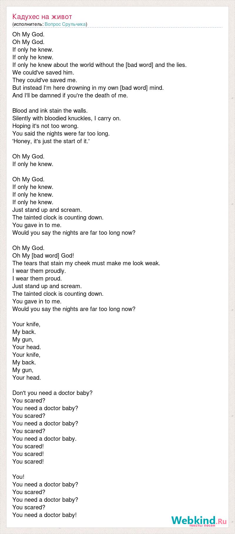 Oh My God. Oh My God. If only he knew. If only he knew. If only he knew about the world without the [bad word] and the lies. We could've saved him. They could've saved me. But instead I'm here drowning in my own [bad word] mind. And I'll be damned if you're the death of me. Blood and ink stain the walls. Silently with bloodied knuckles, I carry on. Hoping it's not too wrong. You said the nights were far too long. 'Honey, it's just the start of it.' Oh My God. If only he knew. Oh My God. If only he knew. If only he knew. If only he knew. Just stand up and scream. The tainted clock is counting down. You gave in to me. Would you say the nights are far too long now? Oh My God. Oh My [bad word] God! The tears that stain my cheek must make me look weak. I wear them proudly. I wear them proud. Just stand up and scream. The tainted clock is counting down. You gave in to me. Would you say the nights are far too long now? Your knife, My back. My gun, Your head. Your knife, My back. My gun, Your head. Don't you need a doctor baby? You scared? You need a doctor baby? You scared? You need a doctor baby? You scared? You need a doctor baby. You scared! You scared! You scared! You! You need a doctor baby? You scared? You need a doctor baby? You scared? You need a doctor baby!