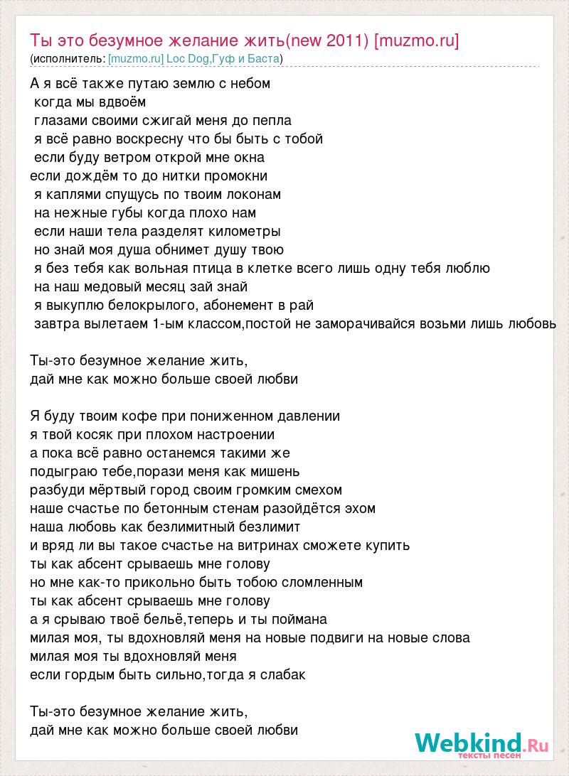 А я всё также путаю землю с небом когда мы вдвоём глазами своими сжигай меня до пепла я всё равно воскресну что бы быть с тобой если буду ветром открой мне окна если дождём то до нитки промокни я каплями спущусь по твоим локонам на нежные губы когда плохо нам если наши тела разделят километры но знай моя душа обнимет душу твою я без тебя как вольная птица в клетке всего лишь одну тебя люблю на наш медовый месяц зай знай я выкуплю белокрылого, абонемент в рай завтра вылетаем 1-ым классом,постой не заморачивайся возьми лишь любовь Ты-это безумное желание жить, дай мне как можно больше своей любви Я буду твоим кофе при пониженном давлении я твой косяк при плохом настроении а пока всё равно останемся такими же подыграю тебе,порази меня как мишень разбуди мёртвый город своим громким смехом наше счастье по бетонным стенам разойдётся эхом наша любовь как безлимитный безлимит и вряд ли вы такое счастье на витринах сможете купить ты как абсент срываешь мне голову но мне как-то прикольно быть тобою сломленным ты как абсент срываешь мне голову а я срываю твоё бельё,теперь и ты поймана милая моя, ты вдохновляй меня на новые подвиги на новые слова милая моя ты вдохновляй меня если гордым быть сильно,тогда я слабак Ты-это безумное желание жить, дай мне как можно больше своей любви