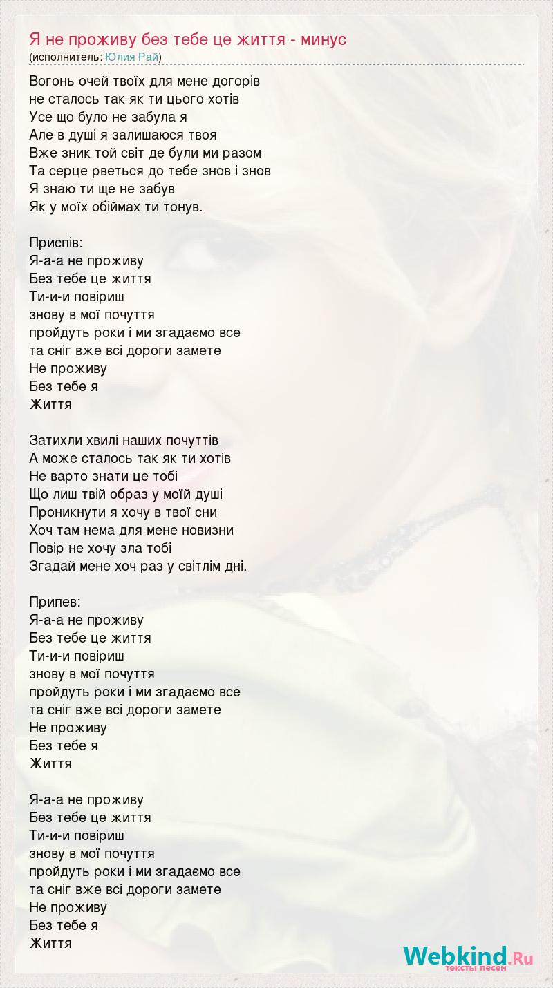 Вогонь очей твоїх для мене догорів не сталось так як ти цього хотів Усе що було не забула я Але в душі я залишаюся твоя Вже зник той світ де були ми разом Та серце рветься до тебе знов і знов Я знаю ти ще не забув Як у моїх обіймах ти тонув. Приспів: Я-а-а не проживу Без тебе це життя Ти-и-и повіриш знову в мої почуття пройдуть роки і ми згадаємо все та сніг вже всі дороги замете Не проживу Без тебе я Життя Затихли хвилі наших почуттів А може сталось так як ти хотів Не варто знати це тобі Що лиш твій образ у моїй душі Проникнути я хочу в твої сни Хоч там нема для мене новизни Повір не хочу зла тобі Згадай мене хоч раз у світлім дні. Припев: Я-а-а не проживу Без тебе це життя Ти-и-и повіриш знову в мої почуття пройдуть роки і ми згадаємо все та сніг вже всі дороги замете Не проживу Без тебе я Життя Я-а-а не проживу Без тебе це життя Ти-и-и повіриш знову в мої почуття пройдуть роки і ми згадаємо все та сніг вже всі дороги замете Не проживу Без тебе я Життя