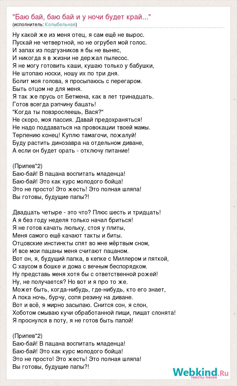 Ну какой же из меня отец, я сам ещё не вырос. Пускай не четвертной, но не огрубел мой голос. И запах из подгузников я бы не вынес, И никогда я в жизни не держал пылесос. Я не могу готовить каши, кушаю только у бабушки, Не штопаю носки, ношу их по три дня. Болит моя голова, я просыпаюсь с перегаром. Быть отцом не для меня. Я так же прусь от Бетмена, как в лет тринадцать. Готов всегда рэпчину бацать! "Когда ты повзрослеешь, Вася?" Не скоро, моя пассия. Давай предохраняться! Не надо поддаваться на провокации твоей мамы. Терпению конец! Куплю тамагочи, пожалуй! Буду растить динозавра на отдельном диване, А если он будет орать - отключу питание! (Припев*2) Баю-бай! В пацана воспитать младенца! Баю-бай! Это как курс молодого бойца! Это не просто! Это жесть! Это полная шляпа! Вы готовы, будущие папы?! Двадцать четыре - это что? Плюс шесть и тридцать! А я без году неделя только начал бриться! Я не готов качать люльку, стоя у плиты, Меня самого ещё качают такты и биты. Отцовские инстинкты спят во мне мёртвым сном, И все мои пацаны меня считают пацаном. Вот он, я, будущий папка, в кепке с Миллером и пяткой, С хаусом в бошке и дома с вечным беспорядком. Ну представь меня хотя бы с ответственной рожей! Ну, не получается? Но вот и я про то же. Может быть, когда-нибудь, где-нибудь, кто его знает, А пока ночь, бурчу, сопя резину на диване. Вот и всё, я мирно засыпаю. Снится сон, я слон, Хоботом смываю кучи обработанной пищи, пищат слонята! Я проснулся в поту, я не готов быть папой! (Припев*2) Баю-бай! В пацана воспитать младенца! Баю-бай! Это как курс молодого бойца! Это не просто! Это жесть! Это полная шляпа! Вы готовы, будущие папы?!