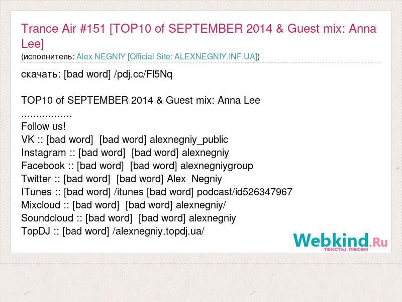 скачать: [bad word] /pdj.cc/Fl5Nq TOP10 of SEPTEMBER 2014 & Guest mix: Anna Lee ................. Follow us! VK :: [bad word] [bad word] alexnegniy_public Instagram :: [bad word] [bad word] alexnegniy Facebook :: [bad word] [bad word] alexnegniygroup Twitter :: [bad word] [bad word] Alex_Negniy ITunes :: [bad word] /itunes [bad word] podcast/id526347967 Mixcloud :: [bad word] [bad word] alexnegniy/ Soundcloud :: [bad word] [bad word] alexnegniy TopDJ :: [bad word] /alexnegniy.topdj.ua/
