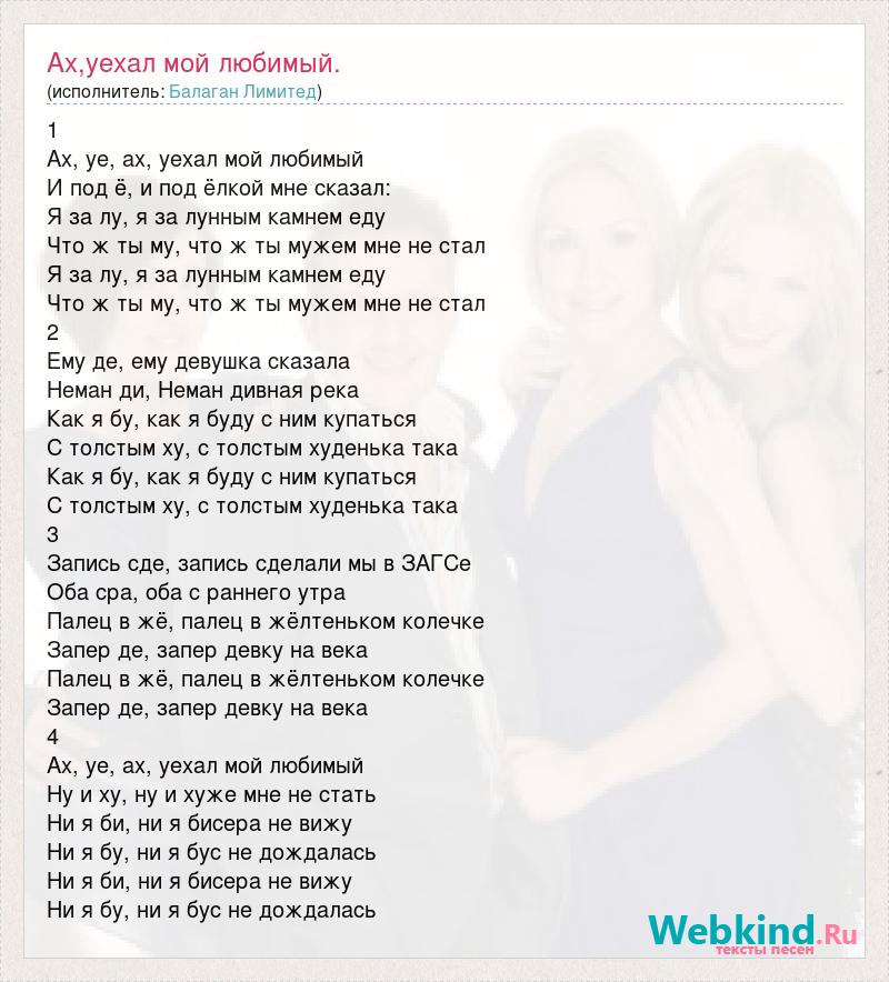 1 Ах, уе, ах, уехал мой любимый И под ё, и под ёлкой мне сказал: Я за лу, я за лунным камнем еду Что ж ты му, что ж ты мужем мне не стал Я за лу, я за лунным камнем еду Что ж ты му, что ж ты мужем мне не стал 2 Ему де, ему девушка сказала Неман ди, Неман дивная река Как я бу, как я буду с ним купаться С толстым ху, с толстым худенька така Как я бу, как я буду с ним купаться С толстым ху, с толстым худенька така 3 Запись сде, запись сделали мы в ЗАГСе Оба сра, оба с раннего утра Палец в жё, палец в жёлтеньком колечке Запер де, запер девку на века Палец в жё, палец в жёлтеньком колечке Запер де, запер девку на века 4 Ах, уе, ах, уехал мой любимый Ну и ху, ну и хуже мне не стать Ни я би, ни я бисера не вижу Ни я бу, ни я бус не дождалась Ни я би, ни я бисера не вижу Ни я бу, ни я бус не дождалась