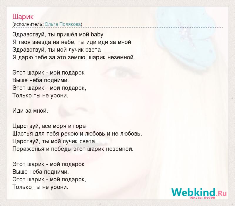 Здравствуй, ты пришёл мой baby Я твоя звезда на небе, ты иди иди за мной Здравствуй, ты мой лучик света Я дарю тебе за это землю, шарик неземной. Этот шарик - мой подарок Выше неба подними. Этот шарик - мой подарок, Только ты не урони. Иди за мной. Царствуй, все моря и горы Щастья для тебя рекою и любовь и не любовь. Царствуй, ты мой лучик света Пораженья и победы этот шарик неземной. Этот шарик - мой подарок Выше неба подними. Этот шарик - мой подарок, Только ты не урони.