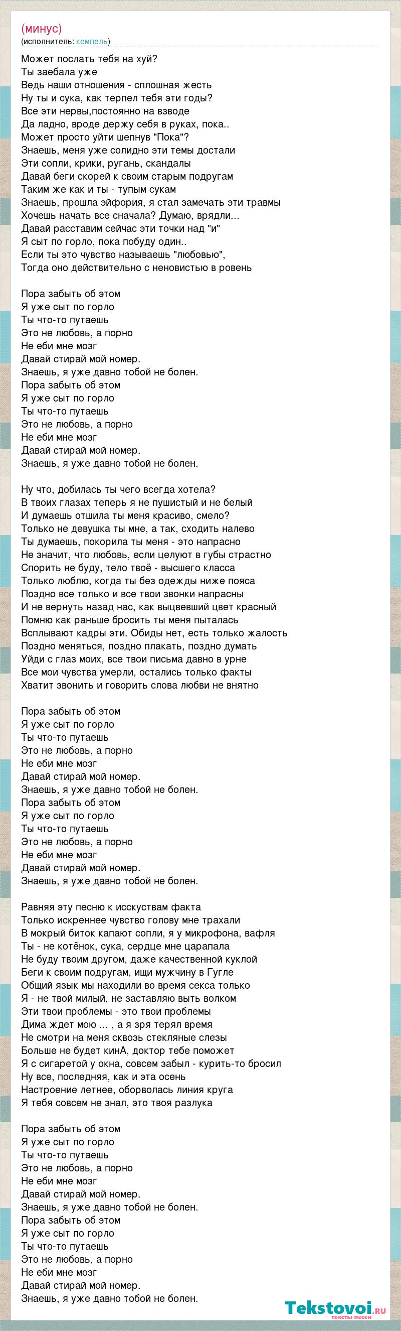 Может послать тебя на хуй? Ты заебала уже Ведь наши отношения - сплошная жесть Ну ты и сука, как терпел тебя эти годы? Все эти нервы,постоянно на взводе Да ладно, вроде держу себя в руках, пока.. Может просто уйти шепнув "Пока"? Знаешь, меня уже солидно эти темы достали Эти сопли, крики, ругань, скандалы Давай беги скорей к своим старым подругам Таким же как и ты - тупым сукам Знаешь, прошла эйфория, я стал замечать эти травмы Хочешь начать все сначала? Думаю, врядли... Давай расставим сейчас эти точки над "и" Я сыт по горло, пока побуду один.. Если ты это чувство называешь "любовью", Тогда оно действительно с неновистью в ровень Пора забыть об этом Я уже сыт по горло Ты что-то путаешь Это не любовь, а порно Не еби мне мозг Давай стирай мой номер. Знаешь, я уже давно тобой не болен. Пора забыть об этом Я уже сыт по горло Ты что-то путаешь Это не любовь, а порно Не еби мне мозг Давай стирай мой номер. Знаешь, я уже давно тобой не болен. Ну что, добилась ты чего всегда хотела? В твоих глазах теперь я не пушистый и не белый И думаешь отшила ты меня красиво, смело? Только не девушка ты мне, а так, сходить налево Ты думаешь, покорила ты меня - это напрасно Не значит, что любовь, если целуют в губы страстно Спорить не буду, тело твоё - высшего класса Только люблю, когда ты без одежды ниже пояса Поздно все только и все твои звонки напрасны И не вернуть назад нас, как выцвевший цвет красный Помню как раньше бросить ты меня пыталась Всплывают кадры эти. Обиды нет, есть только жалость Поздно меняться, поздно плакать, поздно думать Уйди с глаз моих, все твои письма давно в урне Все мои чувства умерли, остались только факты Хватит звонить и говорить слова любви не внятно Пора забыть об этом Я уже сыт по горло Ты что-то путаешь Это не любовь, а порно Не еби мне мозг Давай стирай мой номер. Знаешь, я уже давно тобой не болен. Пора забыть об этом Я уже сыт по горло Ты что-то путаешь Это не любовь, а порно Не еби мне мозг Давай стирай мой номер. Знаешь, я уже давно тобой не болен. Равняя эту песню к исскуствам факта Только искреннее чувство голову мне трахали В мокрый биток капают сопли, я у микрофона, вафля Ты - не котёнок, сука, сердце мне царапала Не буду твоим другом, даже качественной куклой Беги к своим подругам, ищи мужчину в Гугле Общий язык мы находили во время секса только Я - не твой милый, не заставляю выть волком Эти твои проблемы - это твои проблемы Дима ждет мою ... , а я зря терял время Не смотри на меня сквозь стекляные слезы Больше не будет кинА, доктор тебе поможет Я с сигаретой у окна, совсем забыл - курить-то бросил Ну все, последняя, как и эта осень Настроение летнее, оборволась линия круга Я тебя совсем не знал, это твоя разлука Пора забыть об этом Я уже сыт по горло Ты что-то путаешь Это не любовь, а порно Не еби мне мозг Давай стирай мой номер. Знаешь, я уже давно тобой не болен. Пора забыть об этом Я уже сыт по горло Ты что-то путаешь Это не любовь, а порно Не еби мне мозг Давай стирай мой номер. Знаешь, я уже давно тобой не болен.