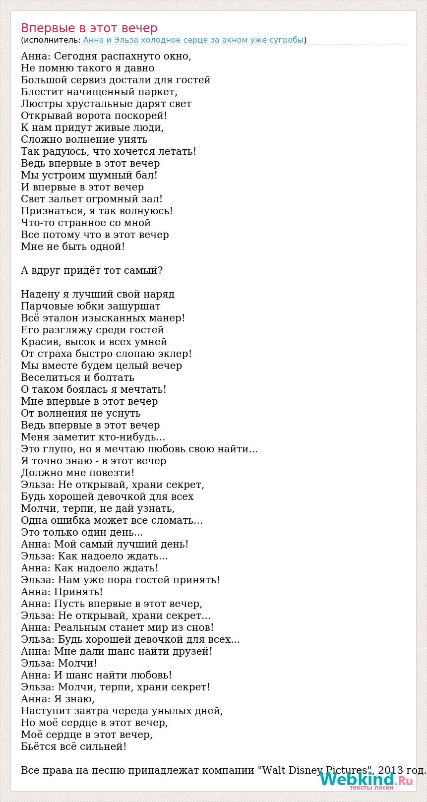 Анна: Сегодня распахнуто окно, Не помню такого я давно Большой сервиз достали для гостей Блестит начищенный паркет, Люстры хрустальные дарят свет Открывай ворота поскорей! К нам придут живые люди, Сложно волнение унять Так радуюсь, что хочется летать! Ведь впервые в этот вечер Мы устроим шумный бал! И впервые в этот вечер Свет зальет огромный зал! Признаться, я так волнуюсь! Что-то странное со мной Все потому что в этот вечер Мне не быть одной! А вдруг придёт тот самый? Надену я лучший свой наряд Парчовые юбки зашуршат Всё эталон изысканных манер! Его разгляжу среди гостей Красив, высок и всех умней От страха быстро слопаю эклер! Мы вместе будем целый вечер Веселиться и болтать О таком боялась я мечтать! Мне впервые в этот вечер От волнения не уснуть Ведь впервые в этот вечер Меня заметит кто-нибудь... Это глупо, но я мечтаю любовь свою найти... Я точно знаю - в этот вечер Должно мне повезти! Эльза: Не открывай, храни секрет, Будь хорошей девочкой для всех Молчи, терпи, не дай узнать, Одна ошибка может все сломать... Это только один день... Анна: Мой самый лучший день! Эльза: Как надоело ждать... Анна: Как надоело ждать! Эльза: Нам уже пора гостей принять! Анна: Принять! Анна: Пусть впервые в этот вечер, Эльза: Не открывай, храни секрет... Анна: Реальным станет мир из снов! Эльза: Будь хорошей девочкой для всех... Анна: Мне дали шанс найти друзей! Эльза: Молчи! Анна: И шанс найти любовь! Эльза: Молчи, терпи, храни секрет! Анна: Я знаю, Наступит завтра череда унылых дней, Но моё сердце в этот вечер, Моё сердце в этот вечер, Бьётся всё сильней! Все права на песню принадлежат компании "Walt Disney Pictures", 2013 год.