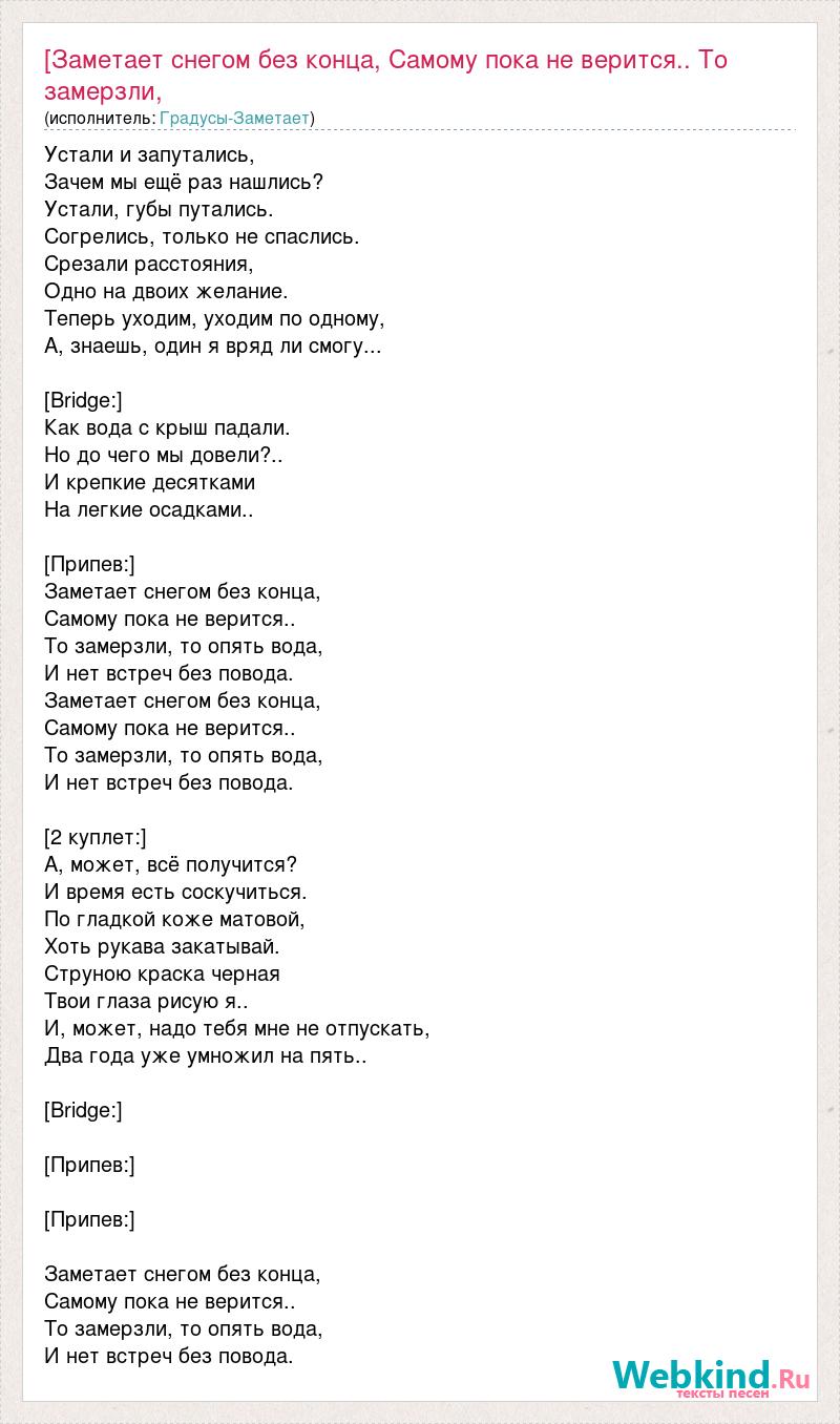 Устали и запутались, Зачем мы ещё раз нашлись? Устали, губы путались. Согрелись, только не спаслись. Срезали расстояния, Одно на двоих желание. Теперь уходим, уходим по одному, А, знаешь, один я вряд ли смогу... [Bridge:] Как вода с крыш падали. Но до чего мы довели?.. И крепкие десятками На легкие осадками.. [Припев:] Заметает снегом без конца, Самому пока не верится.. То замерзли, то опять вода, И нет встреч без повода. Заметает снегом без конца, Самому пока не верится.. То замерзли, то опять вода, И нет встреч без повода. [2 куплет:] А, может, всё получится? И время есть соскучиться. По гладкой коже матовой, Хоть рукава закатывай. Струною краска черная Твои глаза рисую я.. И, может, надо тебя мне не отпускать, Два года уже умножил на пять.. [Bridge:] [Припев:] [Припев:] Заметает снегом без конца, Самому пока не верится.. То замерзли, то опять вода, И нет встреч без повода.