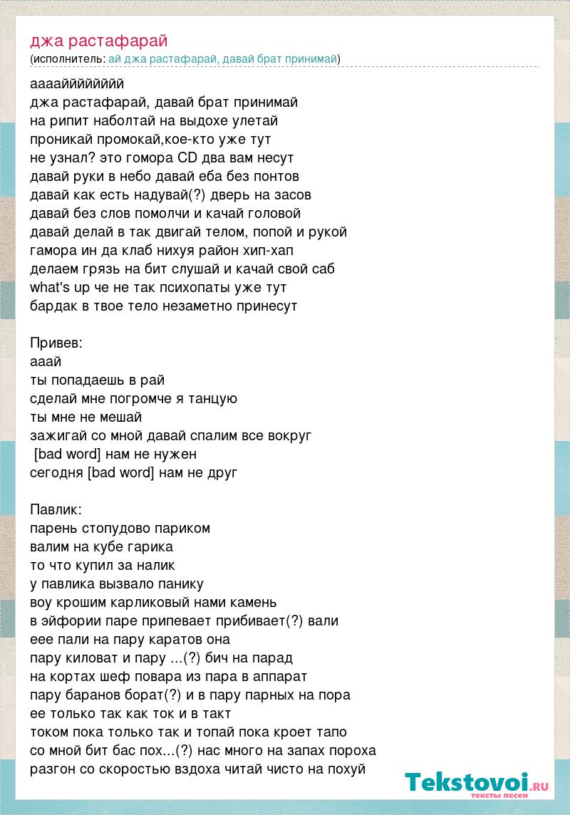 аааайййййййй джа растафарай, давай брат принимай на рипит наболтай на выдохе улетай проникай промокай,кое-кто уже тут не узнал? это гомора CD два вам несут давай руки в небо давай еба без понтов давай как есть надувай(?) дверь на засов давай без слов помолчи и качай головой давай делай в так двигай телом, попой и рукой гамора ин да клаб нихуя район хип-хап делаем грязь на бит слушай и качай свой саб what's up че не так психопаты уже тут бардак в твое тело незаметно принесут Привев: ааай ты попадаешь в рай сделай мне погромче я танцую ты мне не мешай зажигай со мной давай спалим все вокруг [bad word] нам не нужен сегодня [bad word] нам не друг Павлик: парень стопудово париком валим на кубе гарика то что купил за налик у павлика вызвало панику воу крошим карликовый нами камень в эйфории паре припевает прибивает(?) вали еее пали на пару каратов она пару киловат и пару ...(?) бич на парад на кортах шеф повара из пара в аппарат пару баранов борат(?) и в пару парных на пора ее только так как ток и в такт током пока только так и топай пока кроет тапо со мной бит бас пох...(?) нас много на запах пороха разгон со скоростью вздоха читай чисто на похуй
