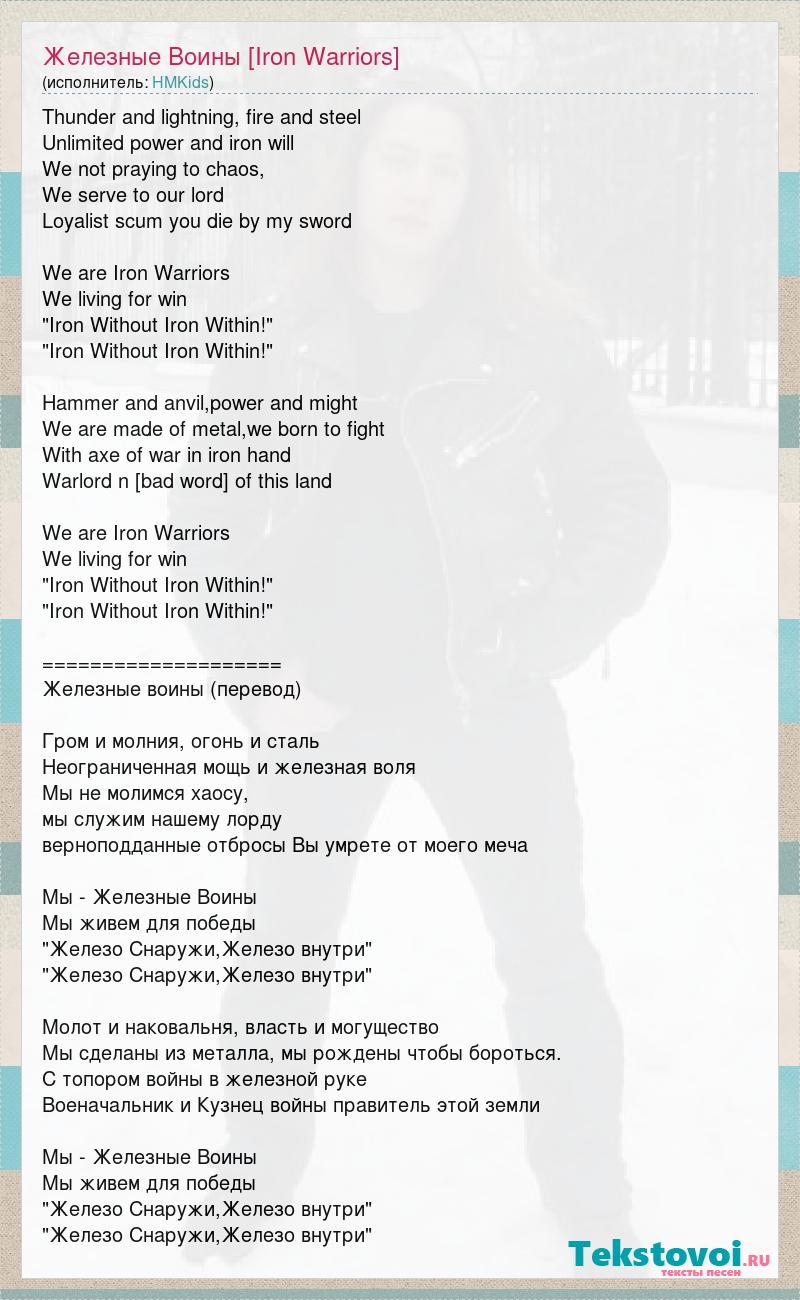 Thunder and lightning, fire and steel Unlimited power and iron will We not praying to chaos, We serve to our lord Loyalist scum you die by my sword We are Iron Warriors We living for win "Iron Without Iron Within!" "Iron Without Iron Within!" Hammer and anvil,power and might We are made of metal,we born to fight With axe of war in iron hand Warlord n Warsmith ruler of this land We are Iron Warriors We living for win "Iron Without Iron Within!" "Iron Without Iron Within!" ==================== Железные воины (перевод) Гром и молния, огонь и сталь Неограниченная мощь и железная воля Мы не молимся хаосу, мы служим нашему лорду верноподданные отбросы Вы умрете от моего меча Мы - Железные Воины Мы живем для победы "Железо Снаружи,Железо внутри" "Железо Снаружи,Железо внутри" Молот и наковальня, власть и могущество Мы сделаны из металла, мы рождены чтобы бороться. С топором войны в железной руке Военачальник и Кузнец войны правитель этой земли Мы - Железные Воины Мы живем для победы "Железо Снаружи,Железо внутри" "Железо Снаружи,Железо внутри"