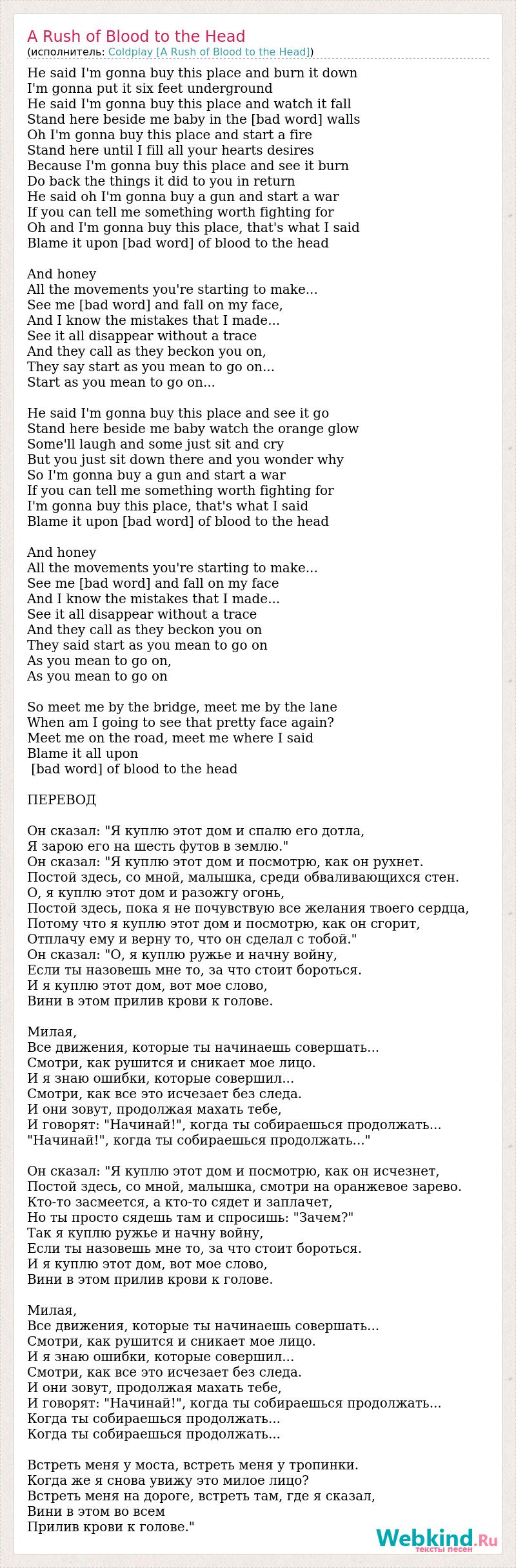 He said I'm gonna buy this place and burn it down I'm gonna put it six feet underground He said I'm gonna buy this place and watch it fall Stand here beside me baby in the [bad word] walls Oh I'm gonna buy this place and start a fire Stand here until I fill all your hearts desires Because I'm gonna buy this place and see it burn Do back the things it did to you in return He said oh I'm gonna buy a gun and start a war If you can tell me something worth fighting for Oh and I'm gonna buy this place, that's what I said Blame it upon [bad word] of blood to the head And honey All the movements you're starting to make... See me [bad word] and fall on my face, And I know the mistakes that I made... See it all disappear without a trace And they call as they beckon you on, They say start as you mean to go on... Start as you mean to go on... He said I'm gonna buy this place and see it go Stand here beside me baby watch the orange glow Some'll laugh and some just sit and cry But you just sit down there and you wonder why So I'm gonna buy a gun and start a war If you can tell me something worth fighting for I'm gonna buy this place, that's what I said Blame it upon [bad word] of blood to the head And honey All the movements you're starting to make... See me [bad word] and fall on my face And I know the mistakes that I made... See it all disappear without a trace And they call as they beckon you on They said start as you mean to go on As you mean to go on, As you mean to go on So meet me by the bridge, meet me by the lane When am I going to see that pretty face again? Meet me on the road, meet me where I said Blame it all upon [bad word] of blood to the head ПЕРЕВОД Он сказал: "Я куплю этот дом и спалю его дотла, Я зарою его на шесть футов в землю." Он сказал: "Я куплю этот дом и посмотрю, как он рухнет. Постой здесь, со мной, малышка, среди обваливающихся стен. О, я куплю этот дом и разожгу огонь, Постой здесь, пока я не почувствую все желания твоего сердца, Потому что я куплю этот дом и посмотрю, как он сгорит, Отплачу ему и верну то, что он сделал с тобой." Он сказал: "О, я куплю ружье и начну войну, Если ты назовешь мне то, за что стоит бороться. И я куплю этот дом, вот мое слово, Вини в этом прилив крови к голове. Милая, Все движения, которые ты начинаешь совершать... Смотри, как рушится и сникает мое лицо. И я знаю ошибки, которые совершил... Смотри, как все это исчезает без следа. И они зовут, продолжая махать тебе, И говорят: "Начинай!", когда ты собираешься продолжать... "Начинай!", когда ты собираешься продолжать..." Он сказал: "Я куплю этот дом и посмотрю, как он исчезнет, Постой здесь, со мной, малышка, смотри на оранжевое зарево. Кто-то засмеется, а кто-то сядет и заплачет, Но ты просто сядешь там и спросишь: "Зачем?" Так я куплю ружье и начну войну, Если ты назовешь мне то, за что стоит бороться. И я куплю этот дом, вот мое слово, Вини в этом прилив крови к голове. Милая, Все движения, которые ты начинаешь совершать... Смотри, как рушится и сникает мое лицо. И я знаю ошибки, которые совершил... Смотри, как все это исчезает без следа. И они зовут, продолжая махать тебе, И говорят: "Начинай!", когда ты собираешься продолжать... Когда ты собираешься продолжать... Когда ты собираешься продолжать... Встреть меня у моста, встреть меня у тропинки. Когда же я снова увижу это милое лицо? Встреть меня на дороге, встреть там, где я сказал, Вини в этом во всем Прилив крови к голове."
