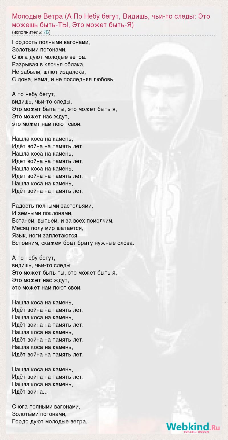 Гордость полными вагонами, Золотыми погонами, С юга дуют молодые ветра. Разрывая в клочья облака, Не забыли, шлют издалека, С дома, мама, и не последняя любовь. А по небу бегут, видишь, чьи-то следы, Это может быть ты, это может быть я, Это может нас ждут, это может нам поют свои. Нашла коса на камень, Идёт война на память лет. Нашла коса на камень, Идёт война на память лет. Нашла коса на камень, Идёт война на память лет. Нашла коса на камень, Идёт война на память лет. Радость полными застольями, И земными поклонами, Встанем, выпьем, и за всех помолчим. Месяц полу мир шатается, Язык, ноги заплетаются Вспомним, скажем брат брату нужные слова. А по небу бегут, видишь, чьи-то следы Это может быть ты, это может быть я, Это может нас ждут, это может нам поют свои. Нашла коса на камень, Идёт война на память лет. Нашла коса на камень, Идёт война на память лет. Нашла коса на камень, Идёт война на память лет. Нашла коса на камень, Идёт война на память лет. Нашла коса на камень, Идёт война на память лет. Нашла коса на камень, Идёт война... С юга полными вагонами, Золотыми погонами, Гордо дуют молодые ветра.