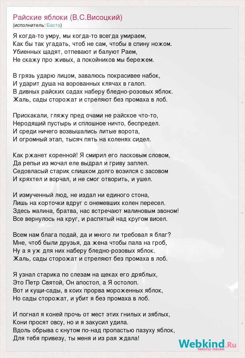 Я когда-то умру, мы когда-то всегда умираем, Как бы так угадать, чтоб не сам, чтобы в спину ножом. Убиенных щадят, отпевают и балуют Раем, Не скажу про живых, а покойников мы бережем. В грязь ударю лицом, завалюсь покрасивее набок, И ударит душа на ворованных клячах в галоп. В дивных райских садах наберу бледно-розовых яблок. Жаль, сады сторожат и стреляют без промаха в лоб. Прискакали, гляжу пред очами не райское что-то, Неродящий пустырь и сплошное ничто, беспредел. И среди ничего возвышались литые ворота, И огромный этап, тысяч пять на коленях сидел. Как ржанет коренной! Я смирил его ласковым словом, Да репьи из мочал еле выдрал и гриву заплел. Седовласый старик слишком долго возился с засовом И кряхтел и ворчал, и не смог отворить, и ушел. И измученный люд, не издал ни единого стона, Лишь на корточки вдруг с онемевших колен пересел. Здесь малина, братва, нас встречают малиновым звоном! Все вернулось на круг, и распятый над кругом висел. Всем нам блага подай, да и много ли требовал я благ? Мне, чтоб были друзья, да жена чтобы пала на гроб, Ну а я уж для них наберу бледно-розовых яблок. Жаль, сады сторожат и стреляют без промаха в лоб. Я узнал старика по слезам на щеках его дряблых, Это Петр Святой, Он апостол, а Я остолоп. Вот и кущи-сады, в коих прорва мороженных яблок, Но сады сторожат, и убит я без промаха в лоб. И погнал я коней прочь от мест этих гнилых и зяблых, Кони просят овсу, но и я закусил удила. Вдоль обрыва с кнутом по-над пропастью пазуху яблок, Для тебя привезу, ты меня и из рая ждала!