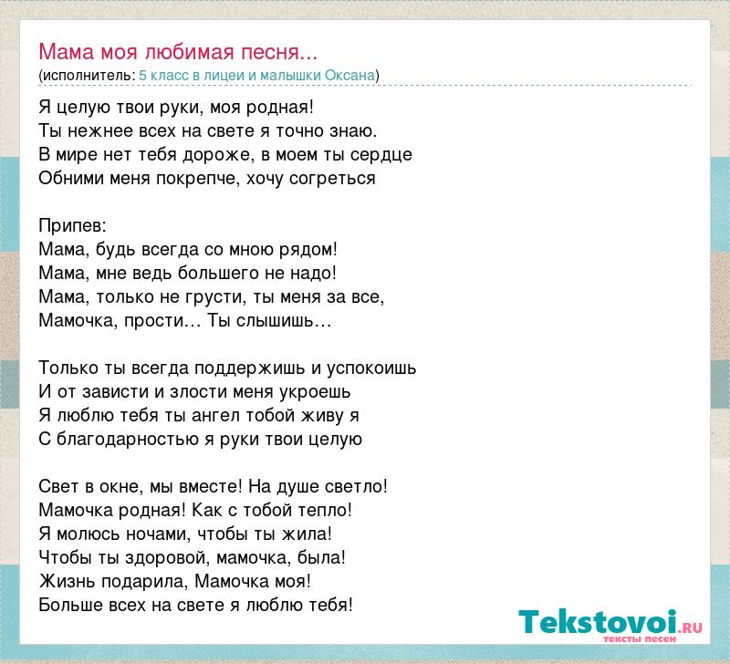 Я целую твои руки, моя родная! Ты нежнее всех на свете я точно знаю. В мире нет тебя дороже, в моем ты сердце Обними меня покрепче, хочу согреться Припев: Мама, будь всегда со мною рядом! Мама, мне ведь большего не надо! Мама, только не грусти, ты меня за все, Мамочка, прости… Ты слышишь… Только ты всегда поддержишь и успокоишь И от зависти и злости меня укроешь Я люблю тебя ты ангел тобой живу я С благодарностью я руки твои целую Свет в окне, мы вместе! На душе светло! Мамочка родная! Как с тобой тепло! Я молюсь ночами, чтобы ты жила! Чтобы ты здоровой, мамочка, была! Жизнь подарила, Мамочка моя! Больше всех на свете я люблю тебя!