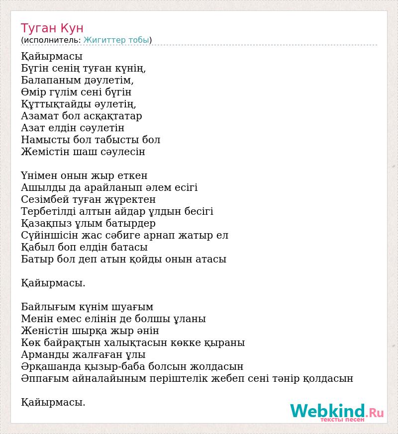 Қайырмасы Бүгін сенің туған күнің, Балапаным дәулетім, Өмір гүлім сені бүгін Құттықтайды әулетің, Азамат бол асқақтатар Азат елдін сәулетін Намысты бол табысты бол Жемістін шаш сәулесін Үнімен онын жыр еткен Ашылды да арайланып әлем есігі Сезімбей туған жүректен Тербетілді алтын айдар ұлдын бесігі Қазақпыз ұлым батырдер Сүйіншісін жас сәбиге арнап жатыр ел Қабыл боп елдін батасы Батыр бол деп атын қойды онын атасы Қайырмасы. Байлығым күнім шуағым Менін емес елінін де болшы ұланы Женістін шырқа жыр әнін Көк байрақтын халықтасын көкке қыраны Арманды жалғаған ұлы Әрқашанда қызыр-баба болсын жолдасын Әппағым айналайыным періштелік жебеп сені тәнір қолдасын Қайырмасы.